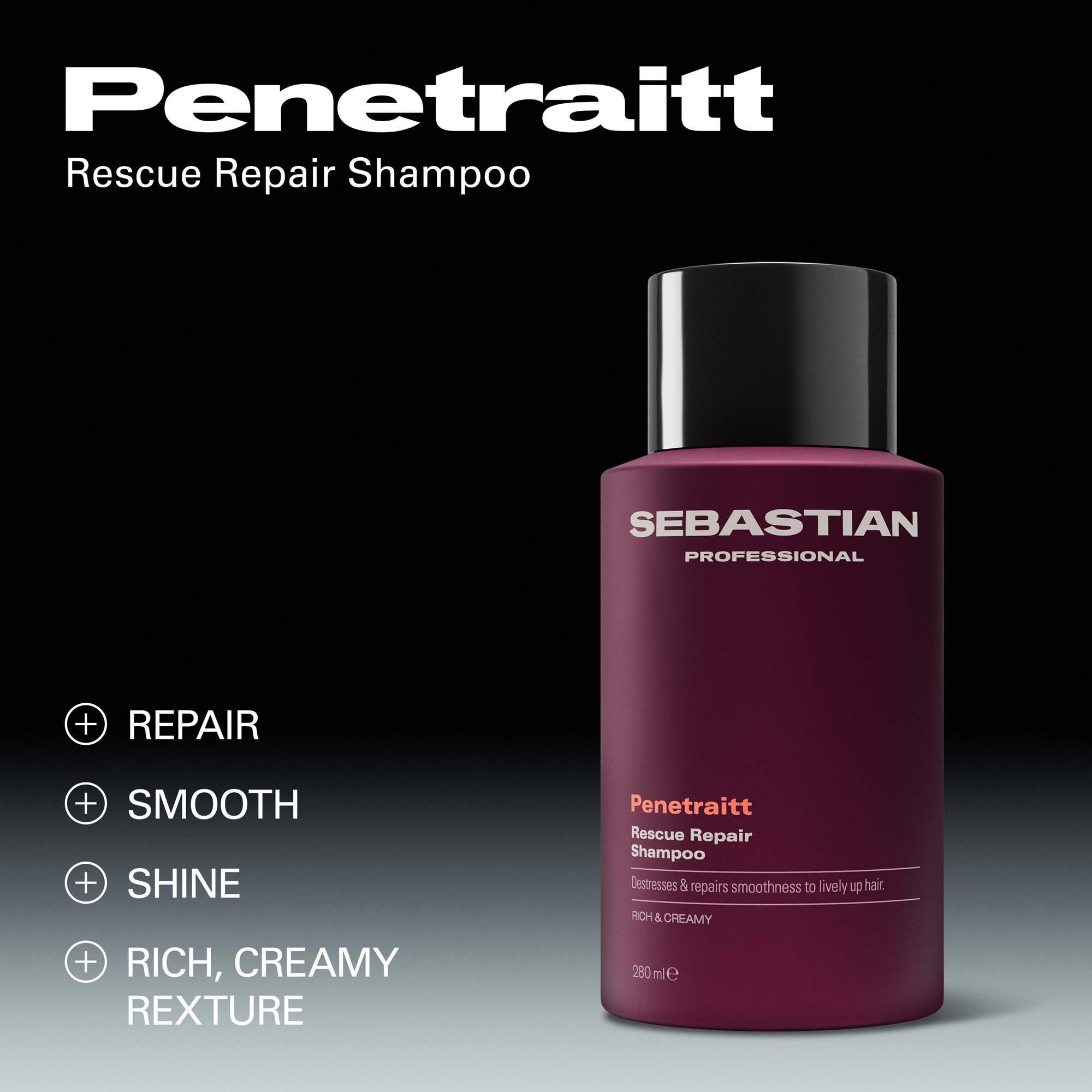 Sebastian Professional Penetraitt Rescue Repair Shampoo, a rich and creamy shampoo for stressed, damaged hair. It provides cleansing nourishment, with D-panthenol helping repair damage to smoothness and shine for revived hair. Penetraitt Shampoo, a shampoo that loves stressed hair.