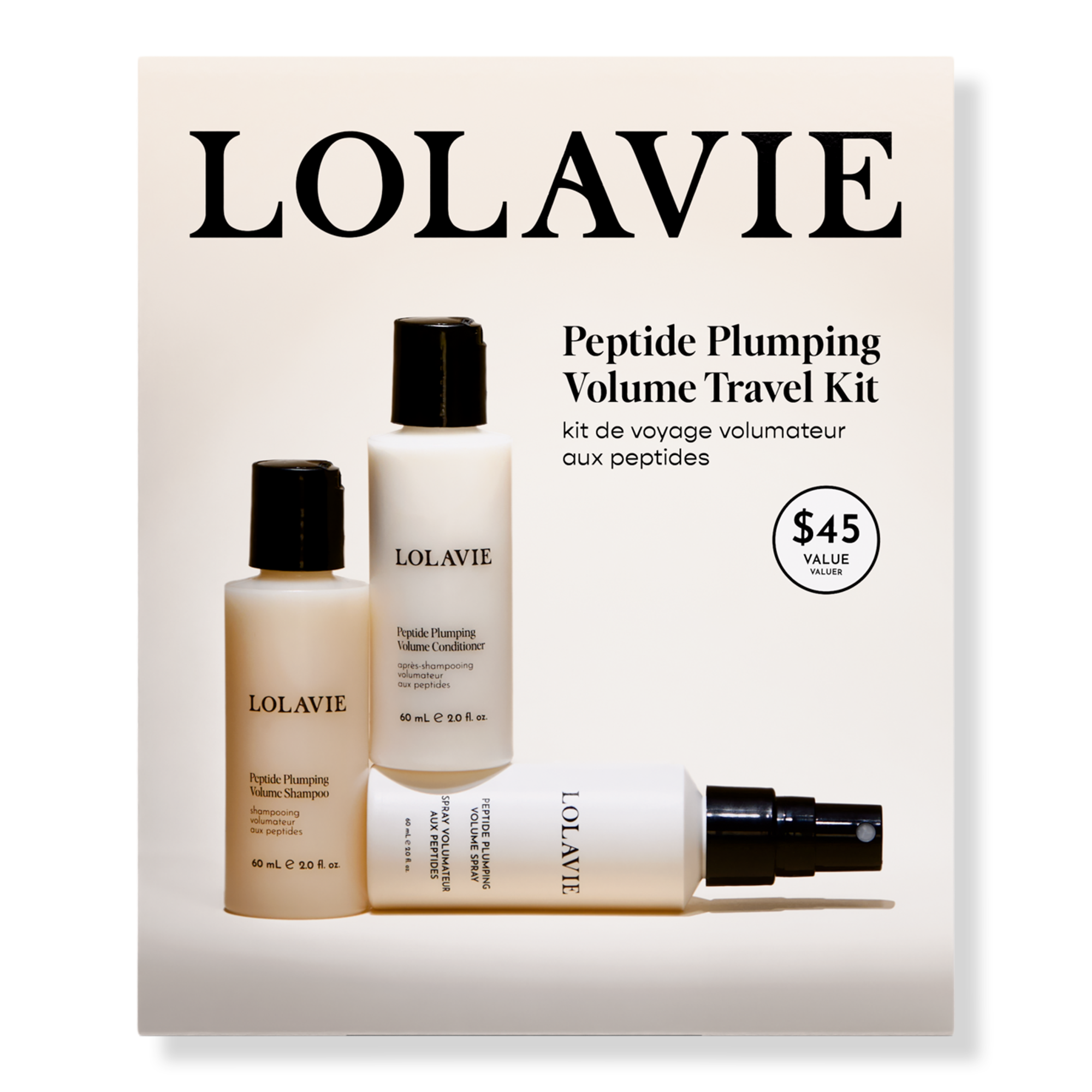 LolaVie Peptide Plumping Volume Travel Kit includes jet-set ready minis of must-have volume essentials with clinically proven peptide formulas for fuller-looking, thicker-looking, lifted hair that's ready to go wherever you are.