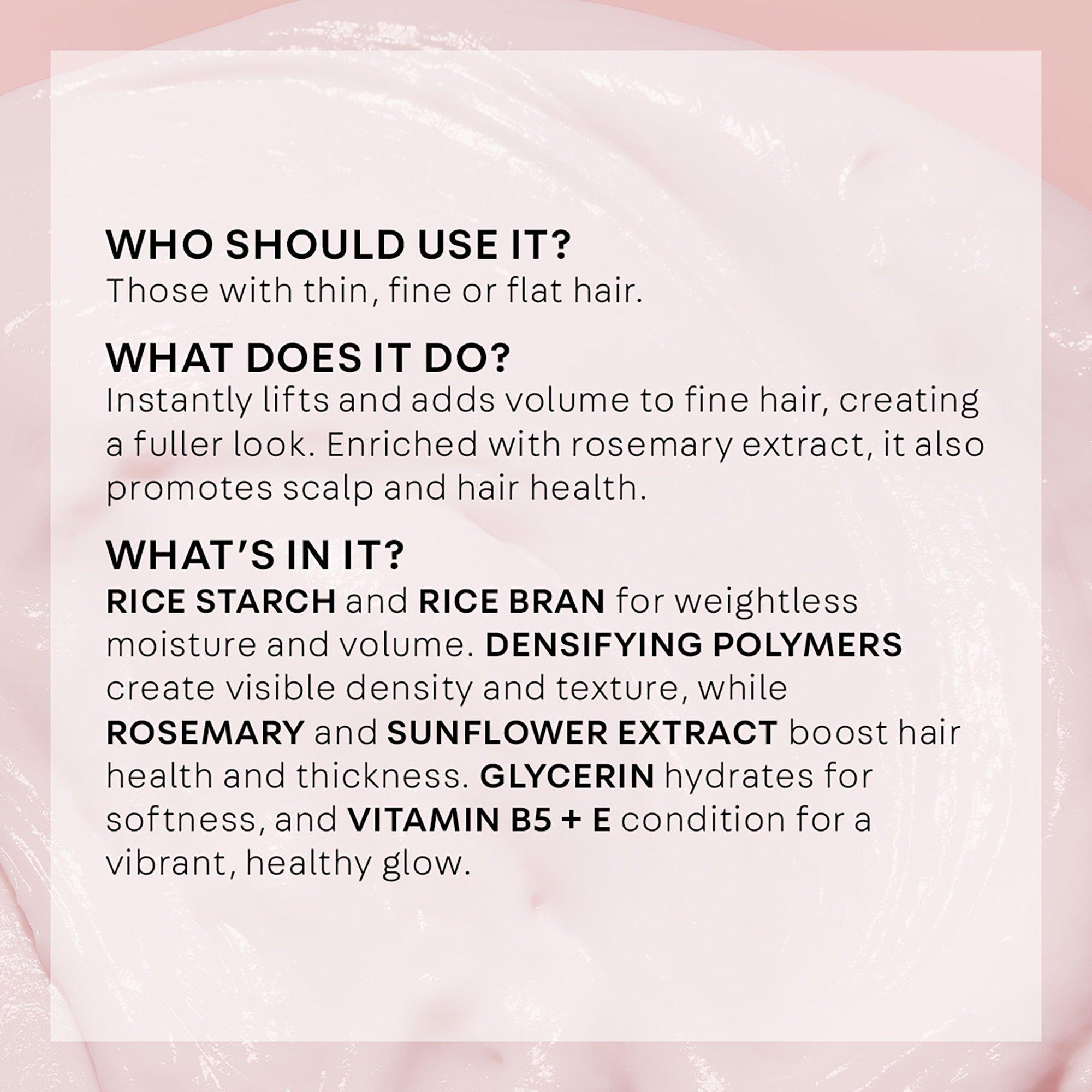 PRO TIP: Apply only to roots for weightless lift or all over hair for volume and density from root to tip.