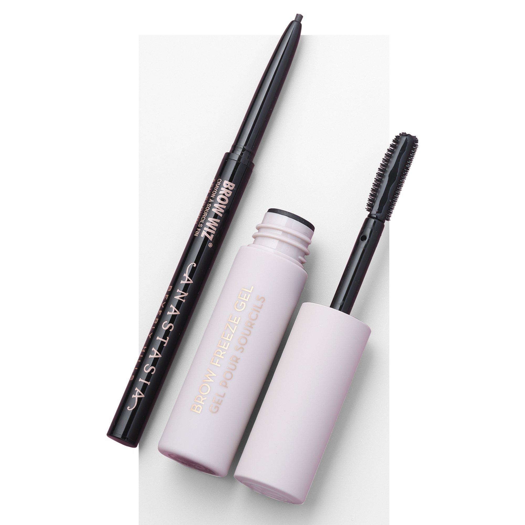 Mini Brow Wiz and Mini Brow Freeze Gel create perfectly shaped, defined brows with a lifted, feathered effect. Mini Brow Wiz offers pro precision, detail and payoff with a formula that mimics hair. Lock brows in place all day with Mini Brow Freeze Gel.