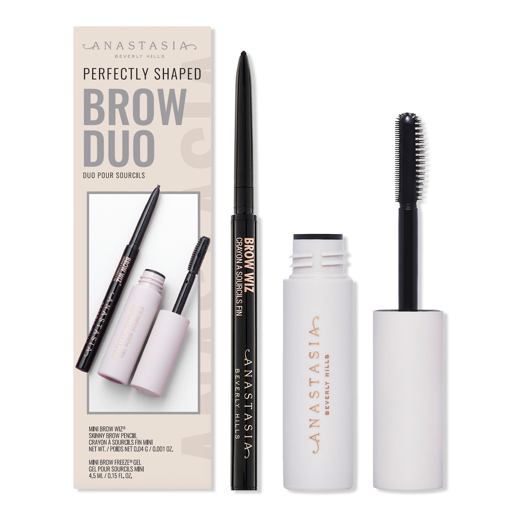 Mini Brow Wiz and Mini Brow Freeze Gel create perfectly shaped, defined brows with a lifted, feathered effect. Mini Brow Wiz offers pro precision, detail and payoff with a formula that mimics hair. Lock brows in place all day with Mini Brow Freeze Gel.