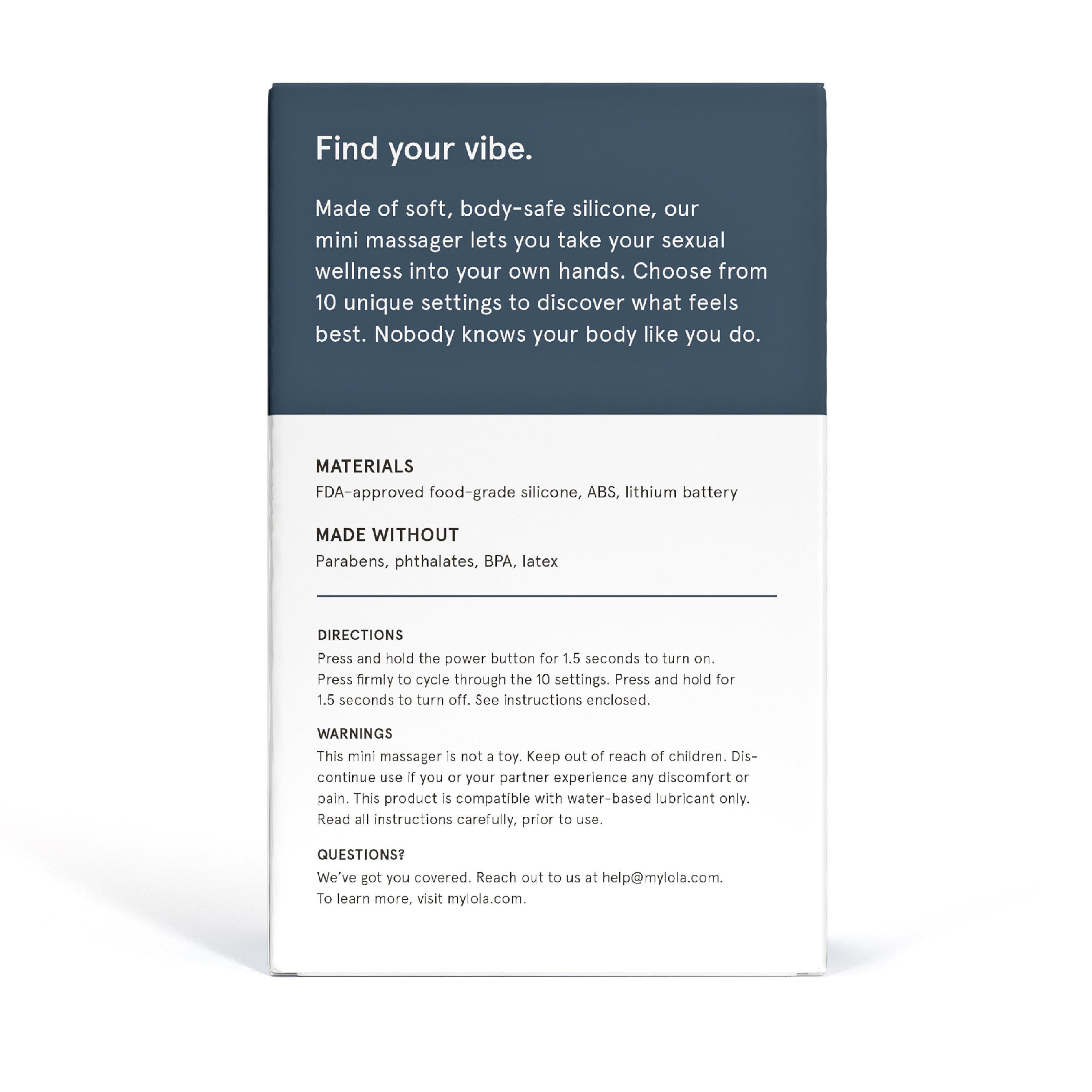 • To use LOLA’s vibrating mini massager: Fully charge your LOLA massager before using it. Press and hold the power button for 1.5 seconds to turn it on. Press the button firmly to cycle through the 10 vibration settings. Press and hold for 1.5 seconds to power off