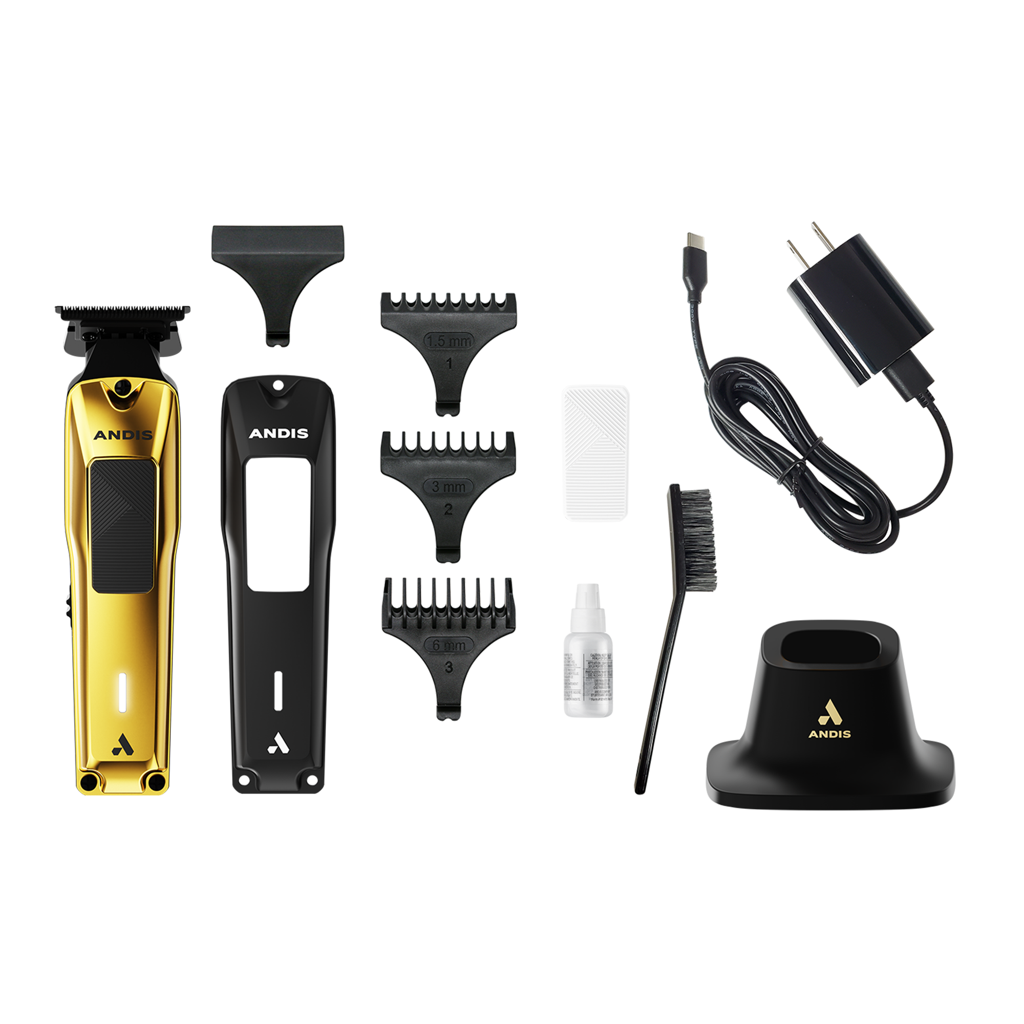 Features• High-speed brushless rotary motor runs at 7,200 SPM for precision detailing.• DLC-coated deep-tooth T-blade for crisp, clean trims.• Interchangeable all-metal cover and grip system with four total color combinations.• Lithium-ion battery delivers up to 4 hours of cordless runtime.• Durable full-metal housing with ergonomic design for all-day comfort.• Universal USB-C charging adapter and premium stand for flexible charging options.• Includes attachment combs (1.5mm, 3mm, 6mm), gold and black covers, black and white grips, blade brush, blade guard, and blade oil.
