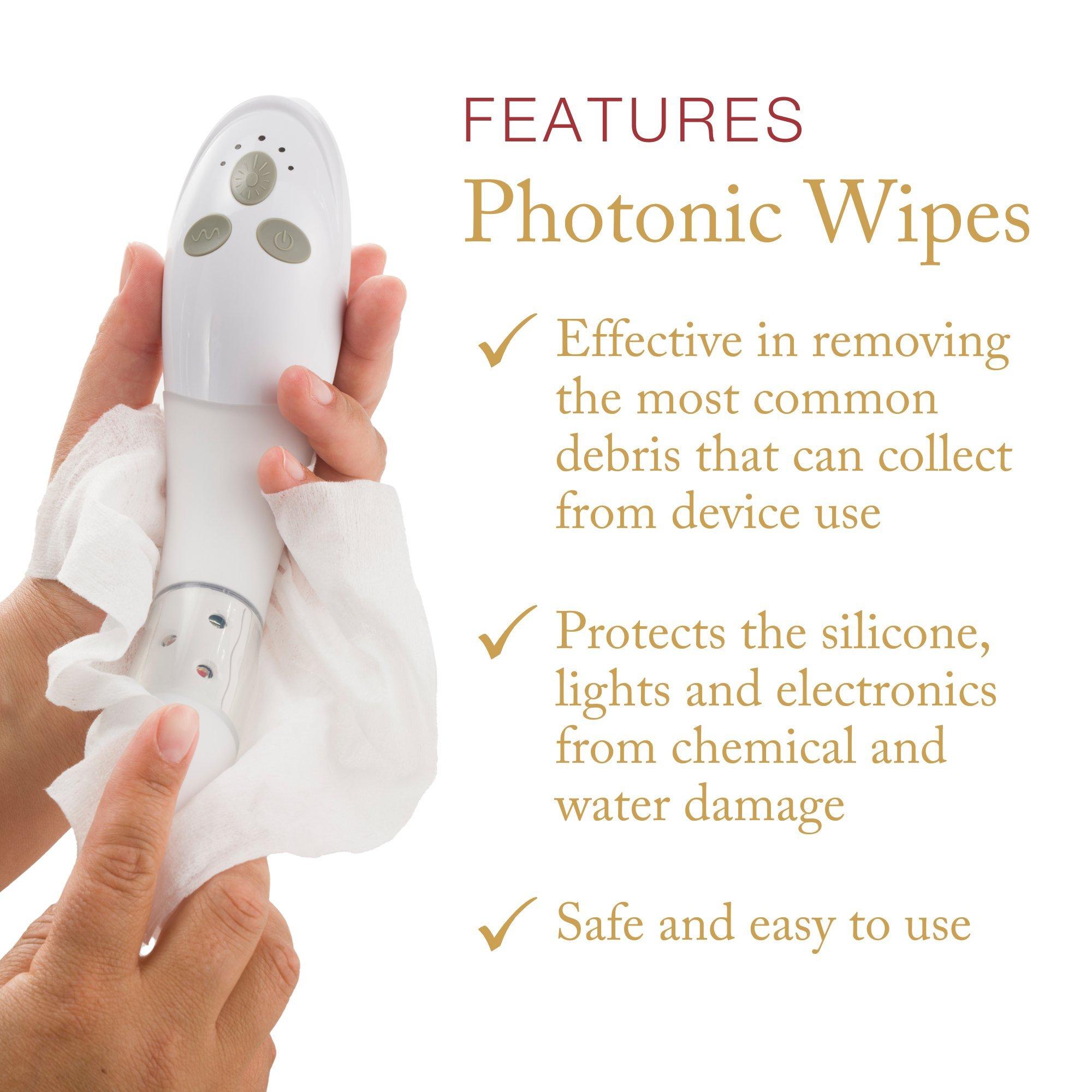 Photonic Wipes specially formulated to clean your Joylux vFit device from harmful bacteria and residue. The ingredients are 99.5% effective in removing the most common germs that can easily collect from vaginal use, while protecting the silicon, lights and electronics from chemical and water damage.