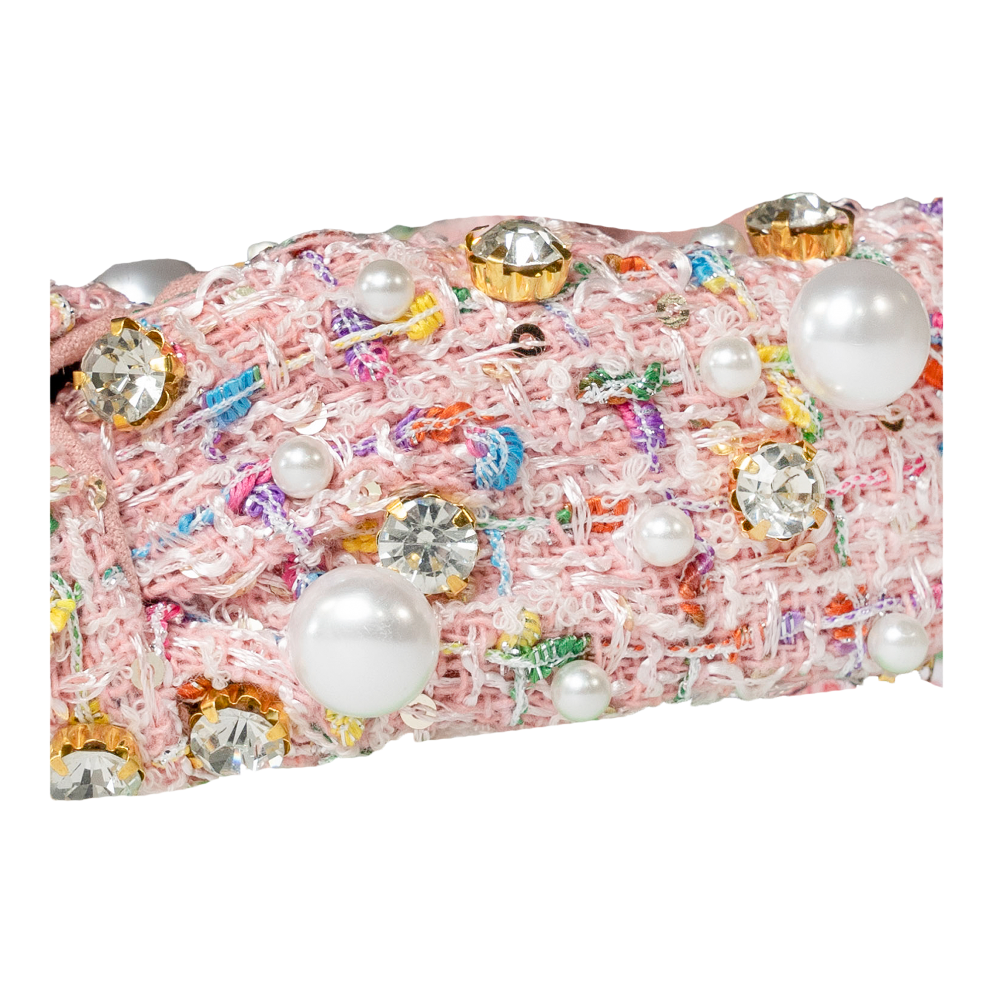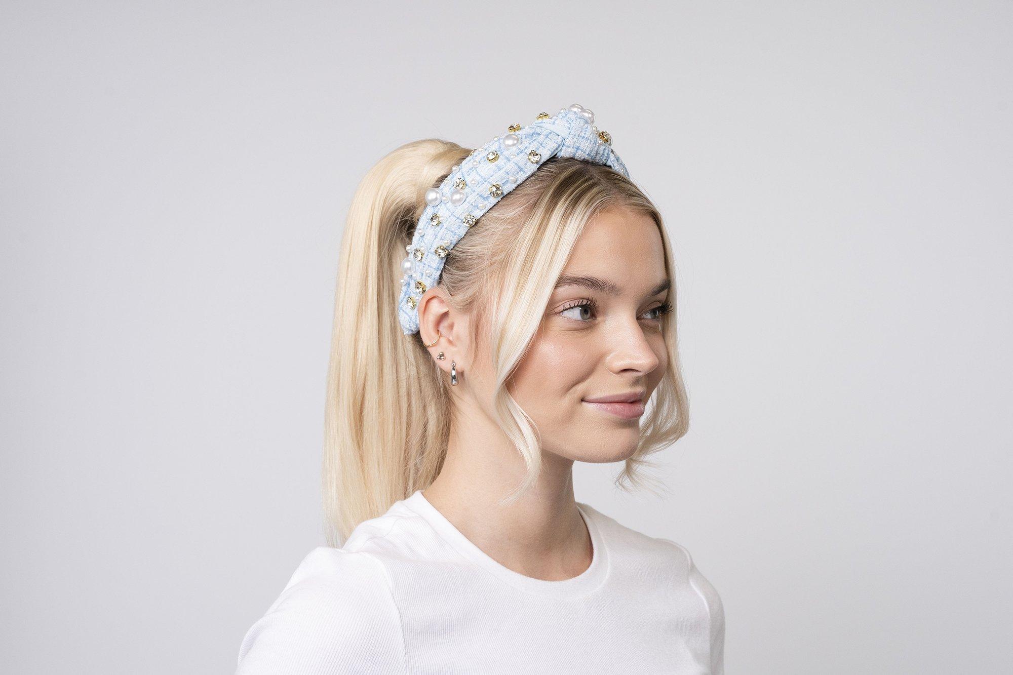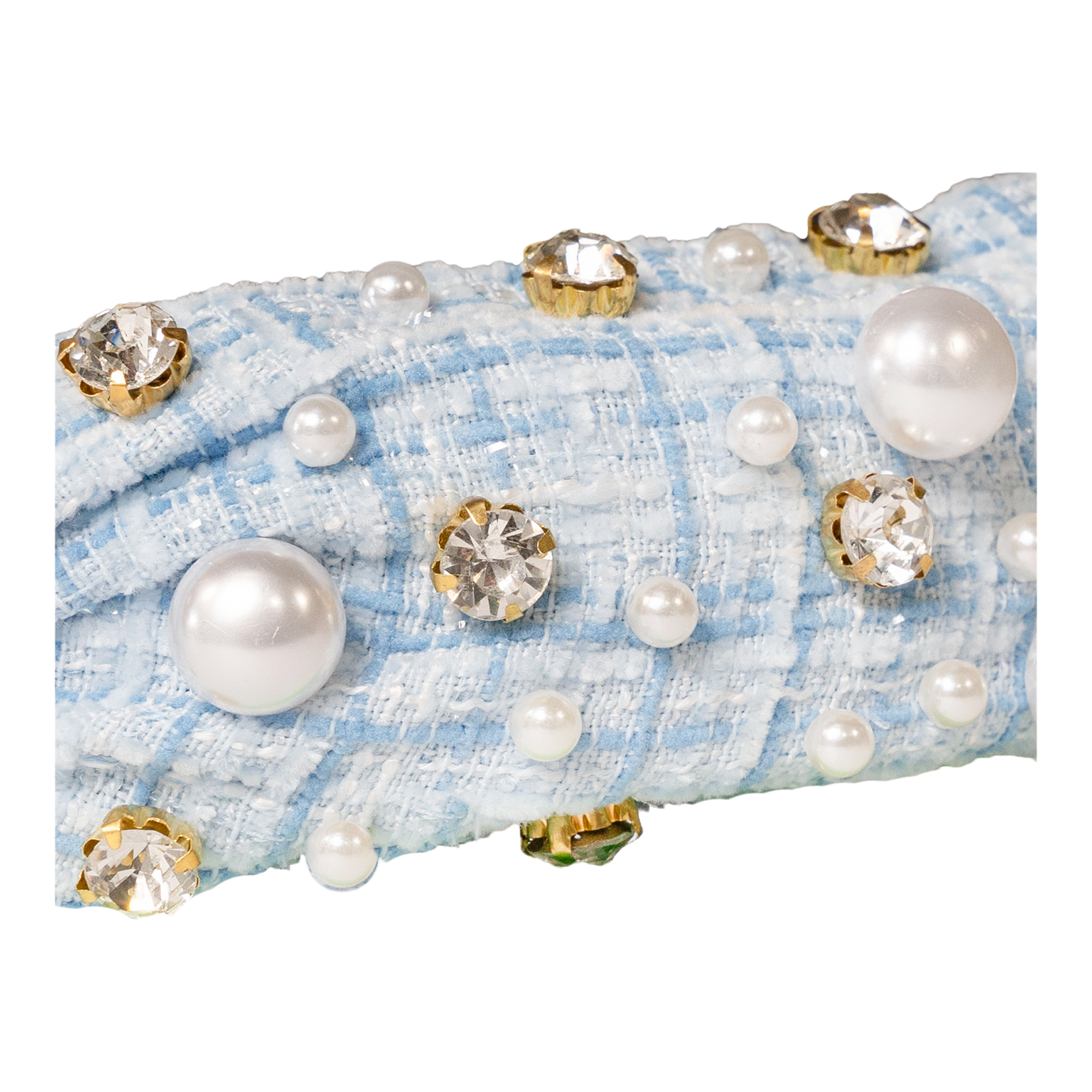 The Plaid & Pearl Headband by Locks & Mane features luxe plaid fabric adorned with glimmering pearls and gold-toned crystals.