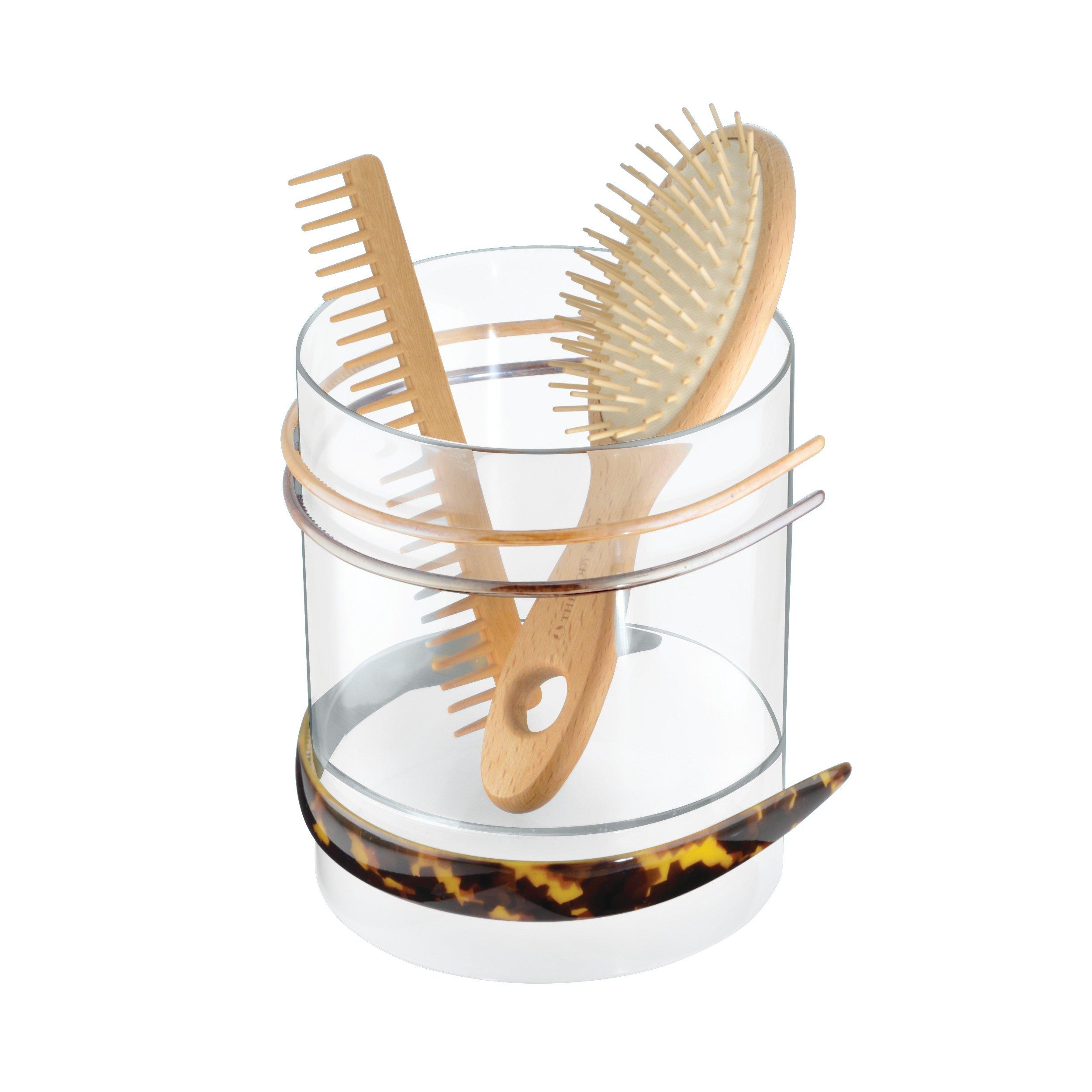 Keep hair accessories in one convenient place with this savvy holder. A short and tall compartment keep brushes and hair ties neatly sorted, and the round shape allows you to wrap headbands around the exterior, making this the all-in-one organizer you need for all your hair accessory needs.