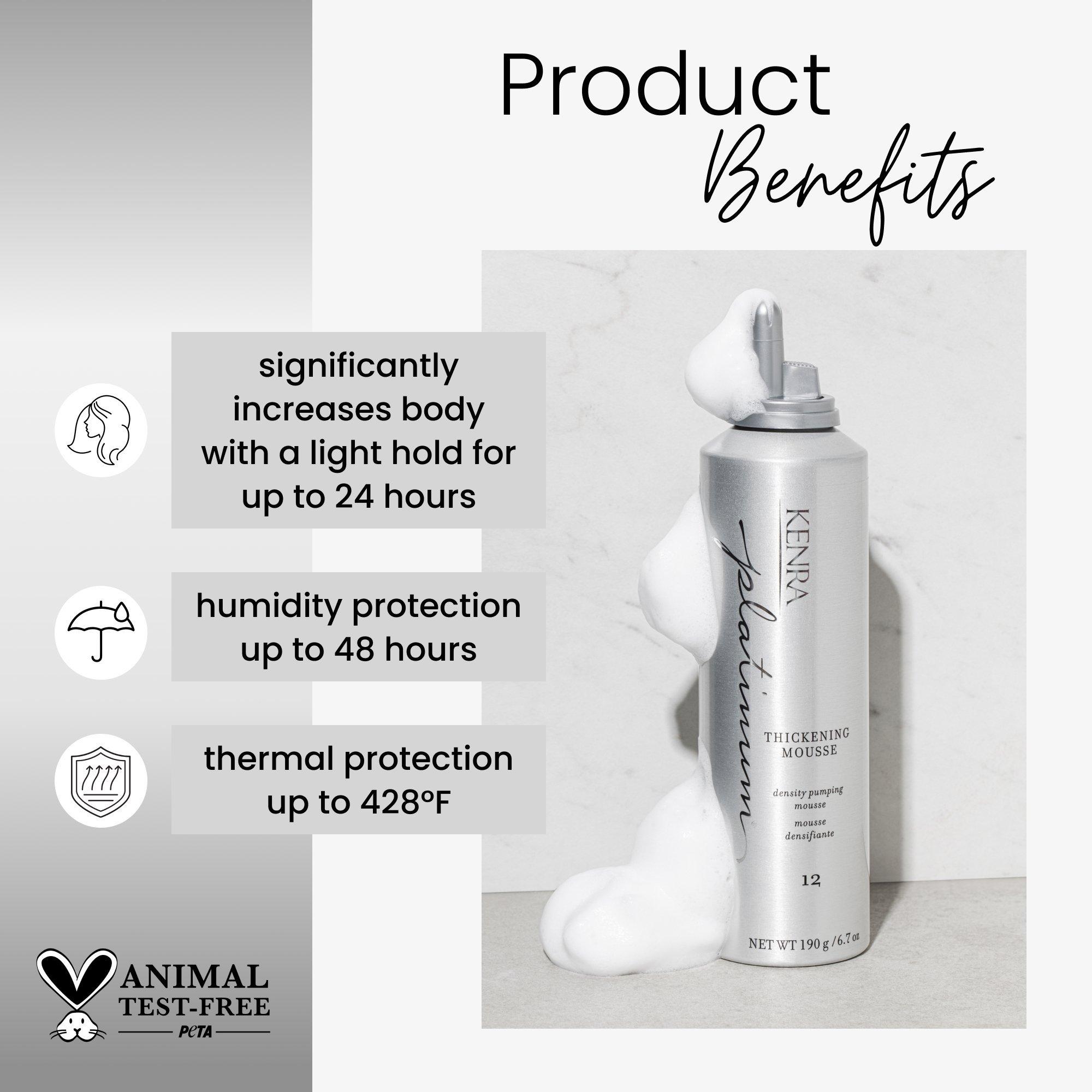 Kenra Platinum Thickening Mousse 12 plumps each strand of hair by up to 150% and adds fullness and body to achieve the appearance of thicker hair. This ultra-lightweight formulation resists humidity for up to 48 hours.