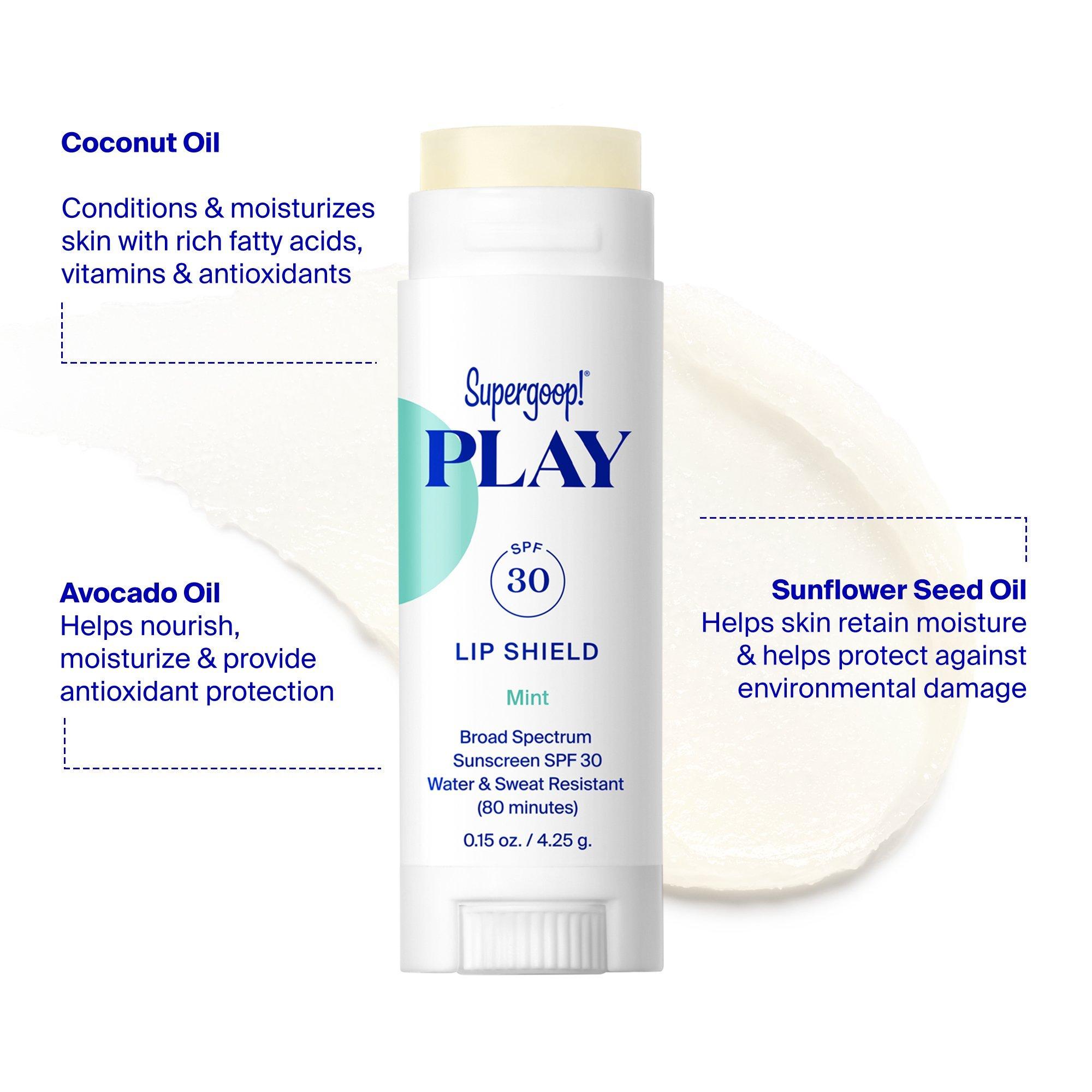 Supergoop! PLAY Lip Shield SPF 30 Sunscreen Lip Balm is a moisturizing lip balm with sun protection & antioxidant-rich coconut oil for the sensitive skin on your lips.