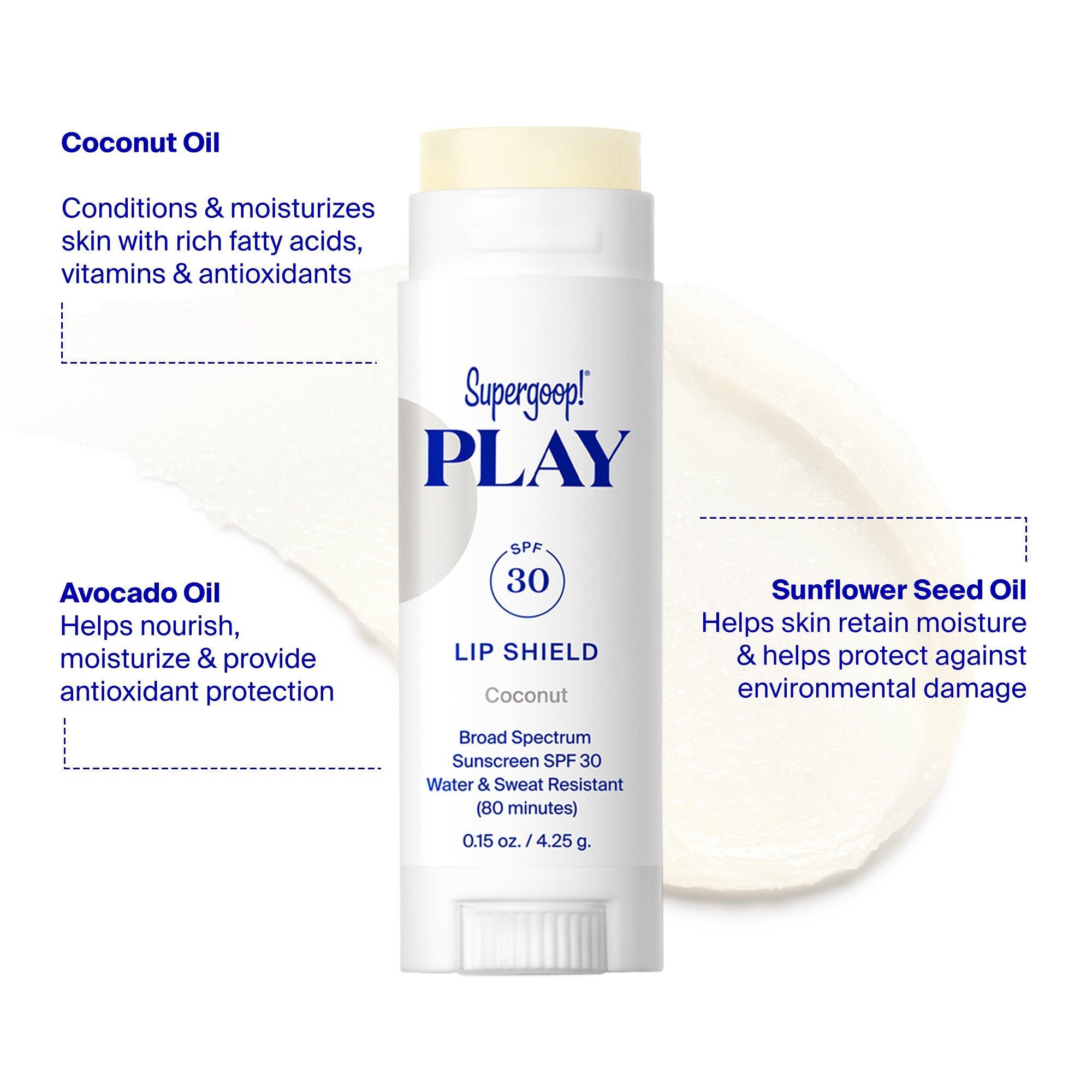 Supergoop! PLAY Lip Shield SPF 30 Sunscreen Lip Balm is a moisturizing lip balm with sun protection & antioxidant-rich coconut oil for the sensitive skin on your lips.