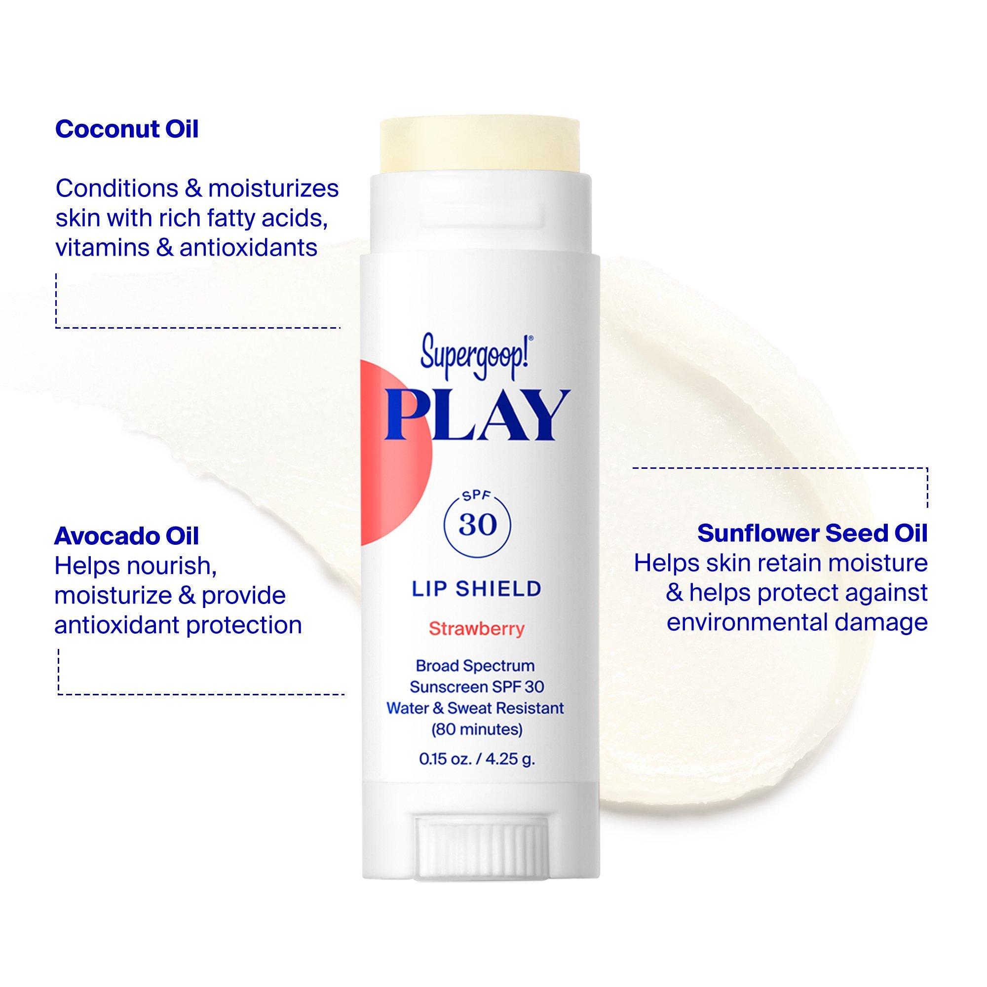 Supergoop! PLAY Lip Shield SPF 30 Sunscreen Lip Balm is a moisturizing lip balm with sun protection & antioxidant-rich coconut oil for the sensitive skin on your lips.