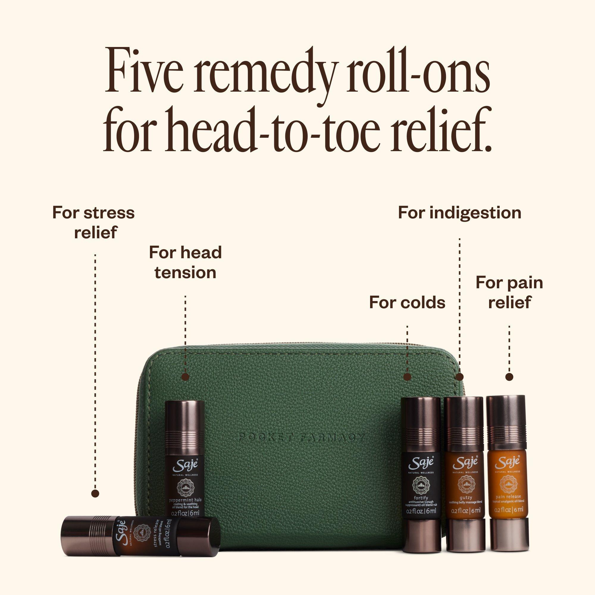 Packed with five essential oil roll-ons, Saje Natural Wellness Pocket Farmacy Physical Edition Full-Body Wellness Kit helps remedy pain, tension, stress, coughs and stomach upset, naturally.