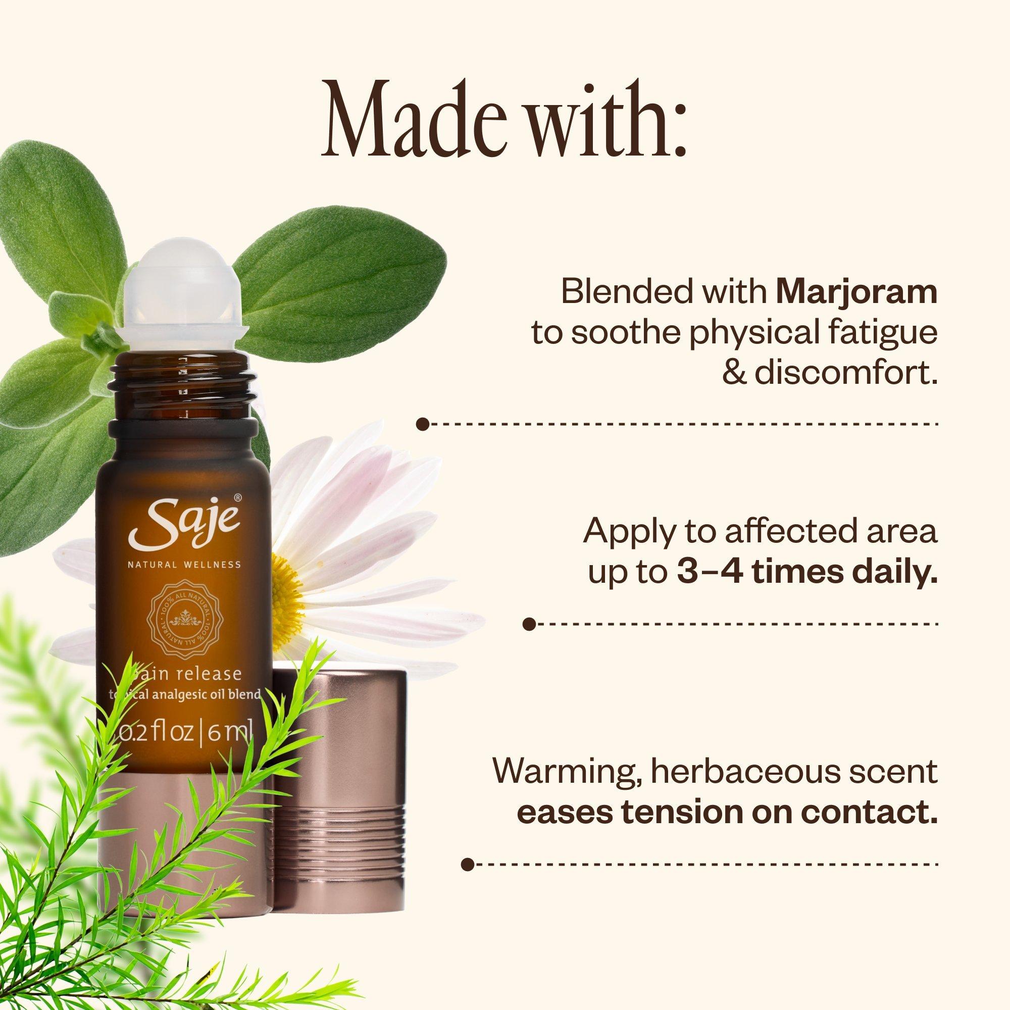 • Marjoram in Pain Release is used to soothe physical fatigue and discomfort.