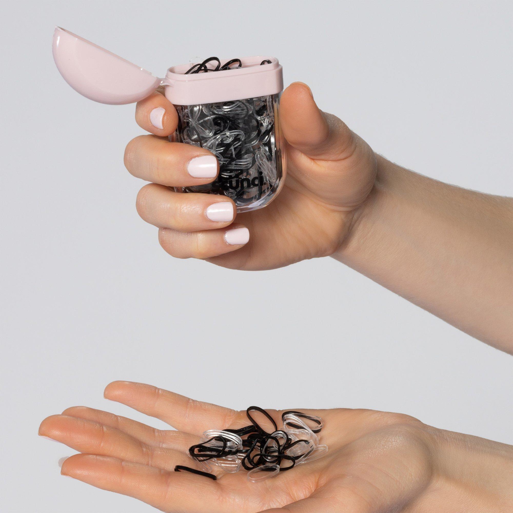 Secure tiny braids, buns, and ponies with Conair polybands that come in a pink storage case. This set of 200 includes black and clear bands designed to help keep small styles neat and in place.