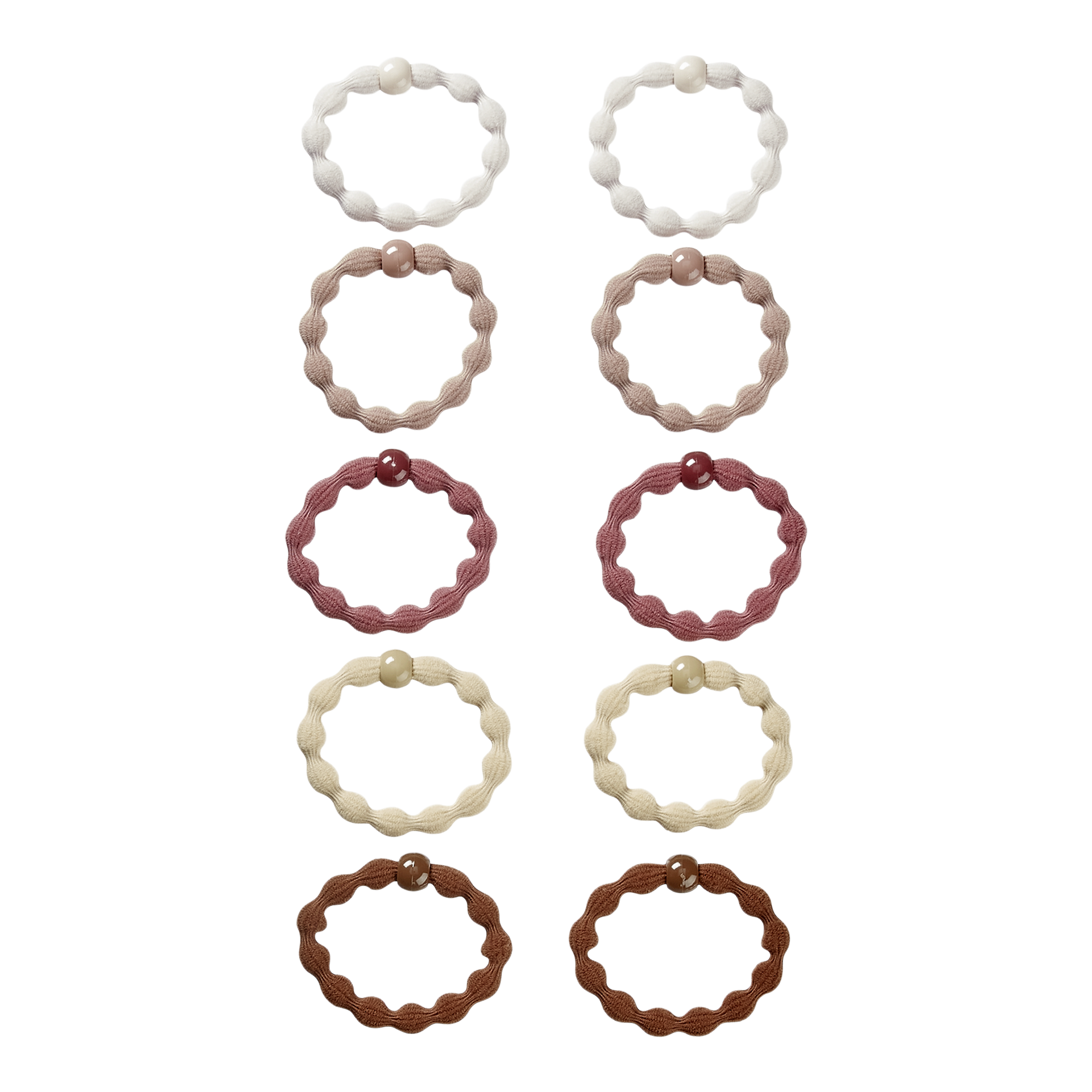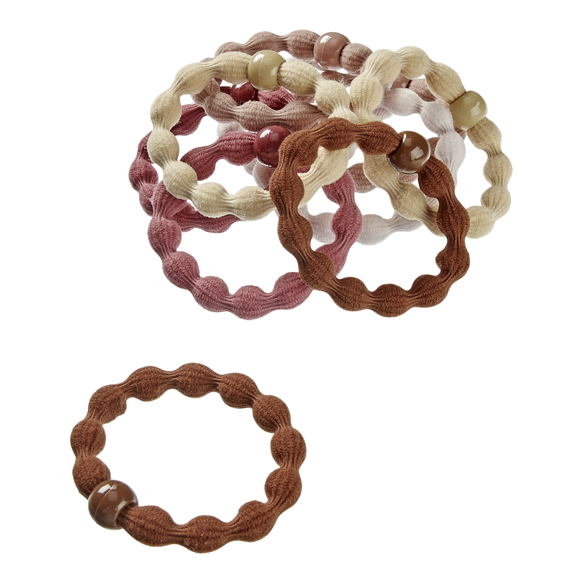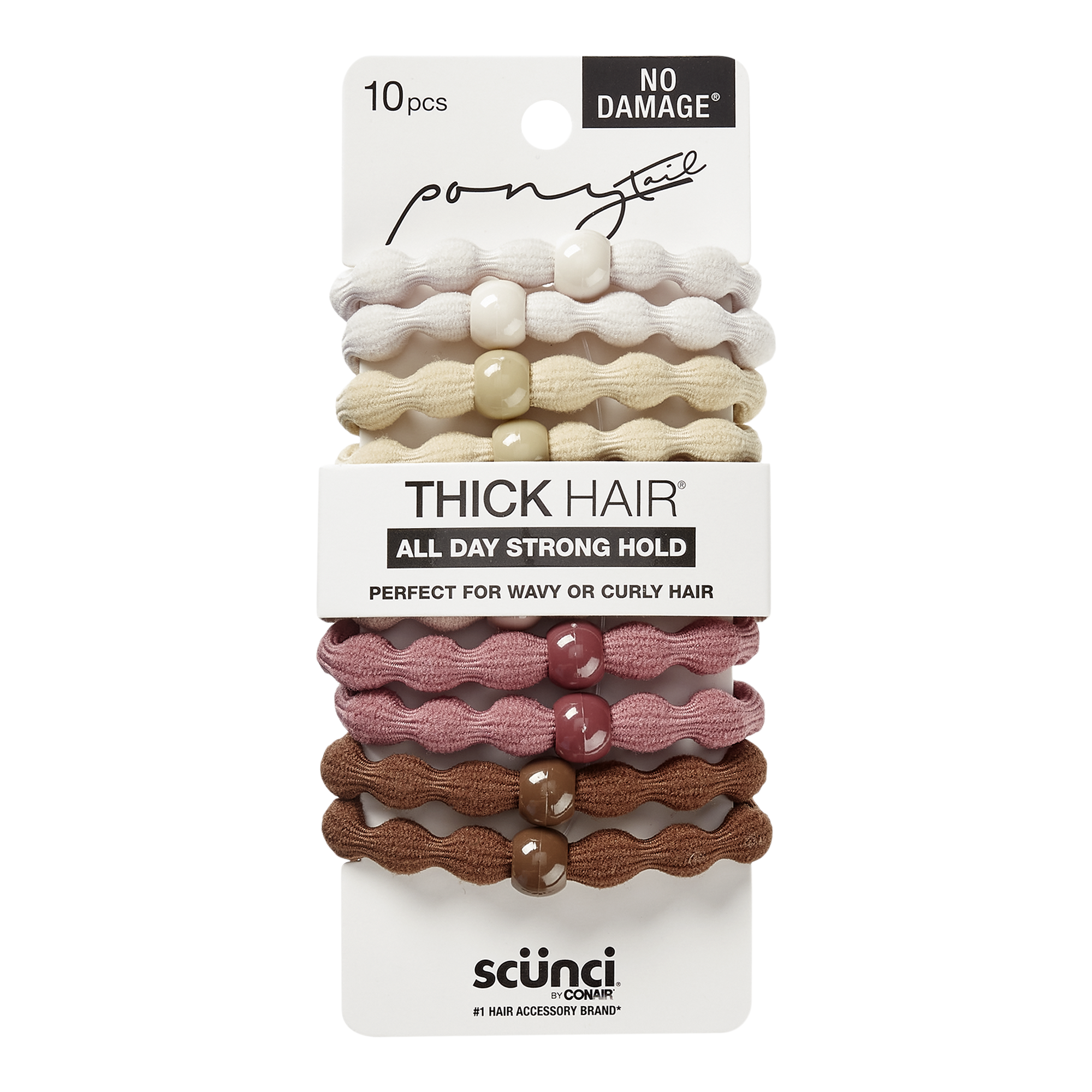 Scünci wavy textured hair ties offer the perfect hold for curly, wavy, and thick hair. Surround hair with one or more of the bead-accented hair elastics to create extra-stylish ponytails, buns, and braids.