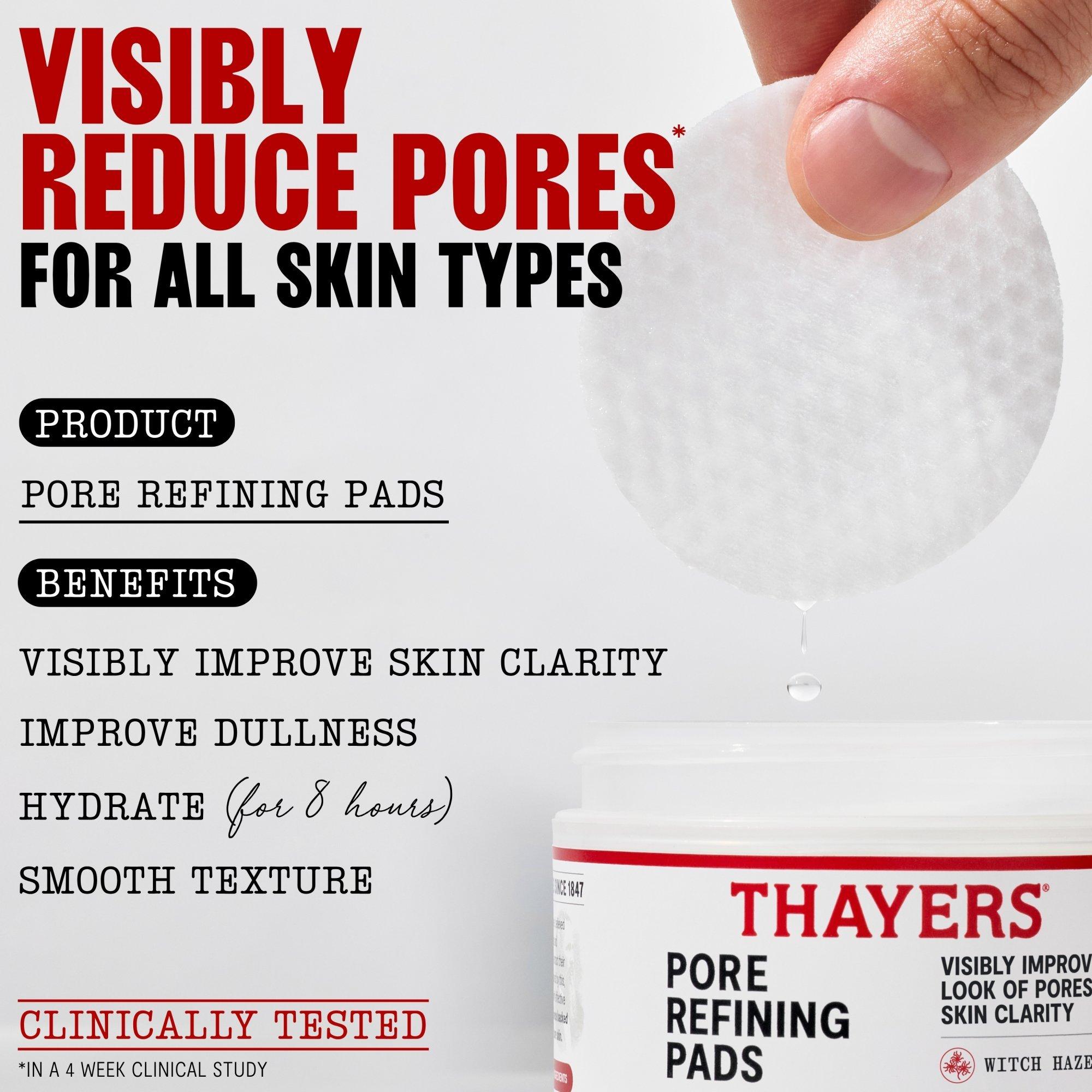 Thayers Pore Refining Pads are clinically proven to improve pores and skin clarity. They feature Witch Hazel, Salicylic Acid, and Hyaluronic Acid.