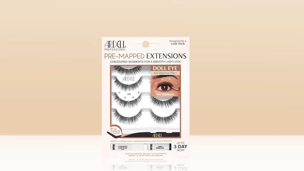 Ardell's Pre-Mapped Extensions take the guesswork out of creating today’s most popular styles. Professional lash techs designed the ideal map with graduating lengths that progressively elongate toward the outer corner for an upswept effect
