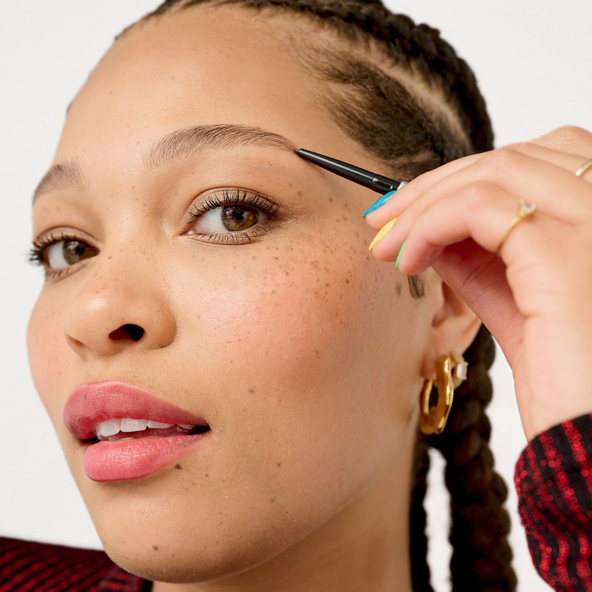 Hold the pencil along the custom control grip. To shape brows, use longer, horizontal strokes along the base of your brow. Fill by drawing short, upward strokes in the direction of your natural hair growth.