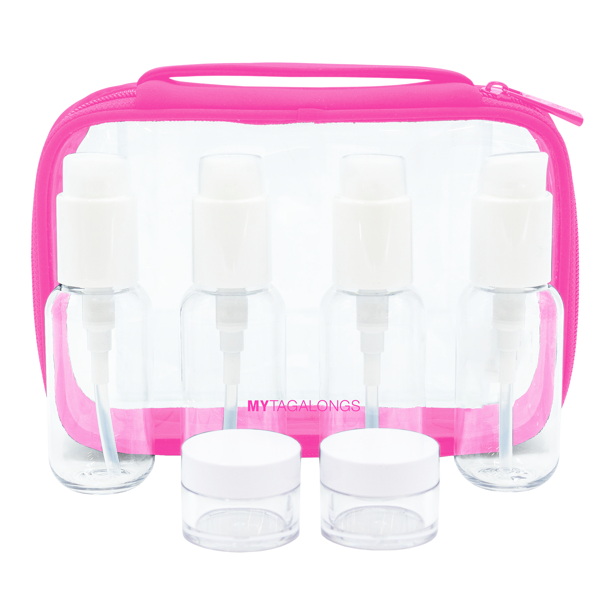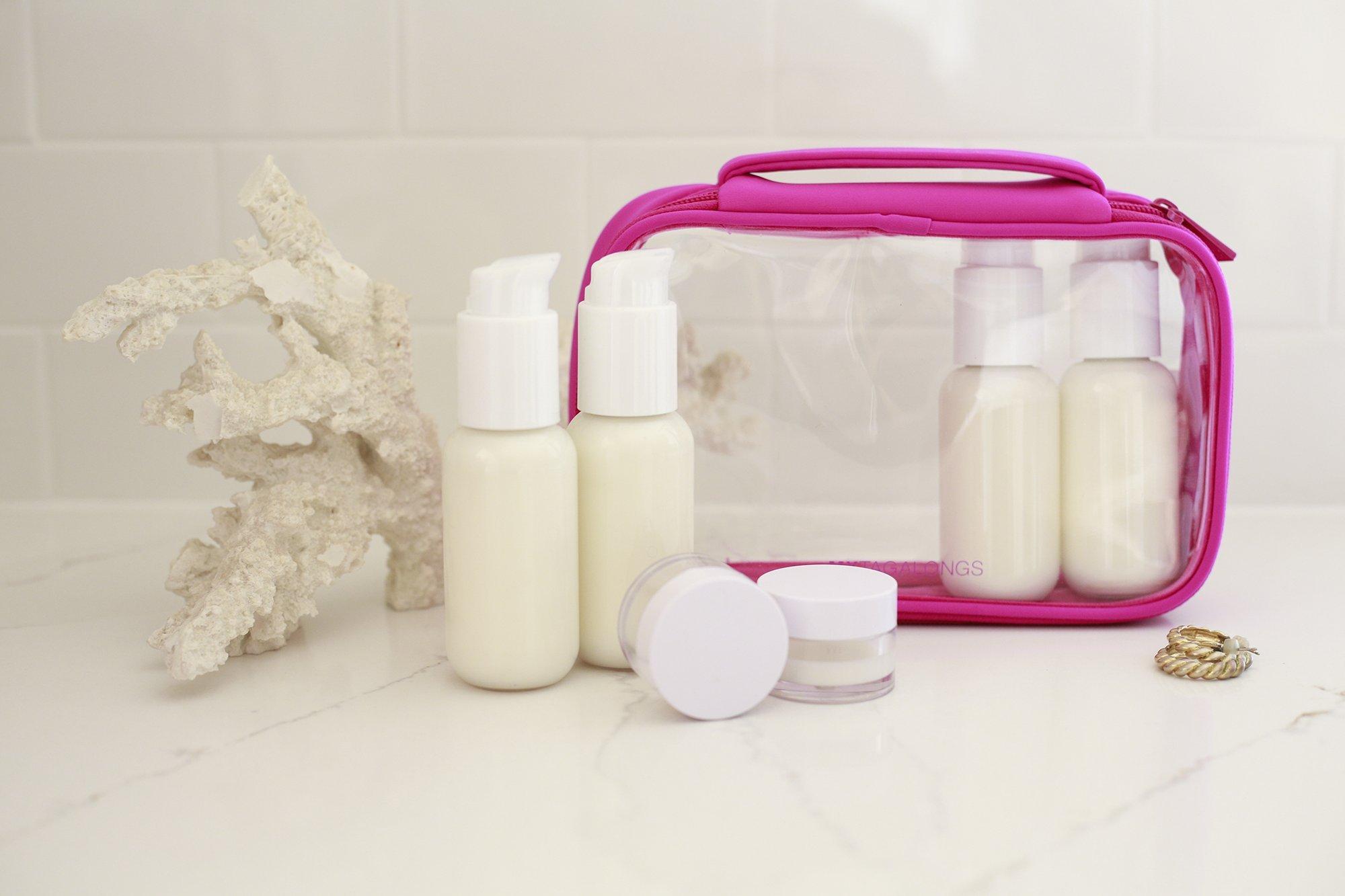 Pack light & pack smart with MYTAGALONGS Premium Travel Bottles with Carrying Case set of reusable, carry-on approved, travel bottles & jars. This refillable set of 4 durable & lightweight bottles & jars comes in a clear reusable zippered pouch that will keep them organized & secure during travel.