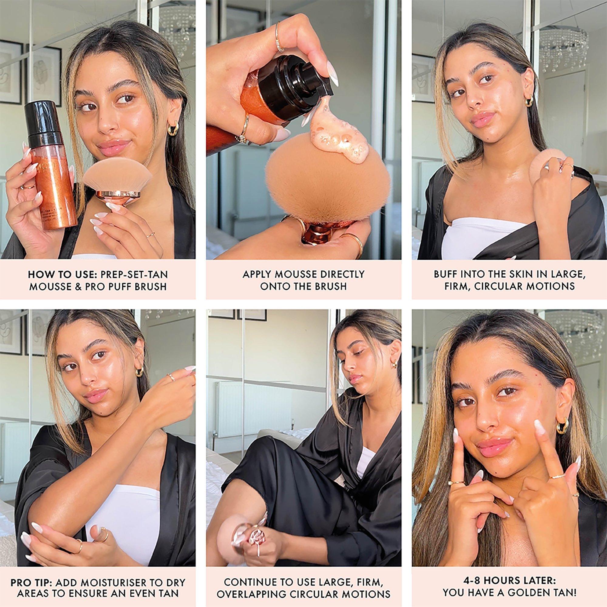 Shake to activate the formula and see the shimmering pearl pigments swirling, then dispense 2-3 pumps of the luscious mousse onto your favorite tanning mitt - or even better, their ultimate Pro-Puff Brush for the most seamless look. Sweep over your body, legs and arms using long, firm continuous motions, before buffing in repeating circular motions to ensure every part of your body is covered with no patches or lines. Watch as the sun-kissed golden tone begins to reveal itself after just 3 hours, and continues to develop for a full 8 hours, leaving you with a 'just-back-from-holiday' radiance. With zero transfer, no 'sticky' feeling and no need to rinse off, it's the ultimate in fake tan convenience.