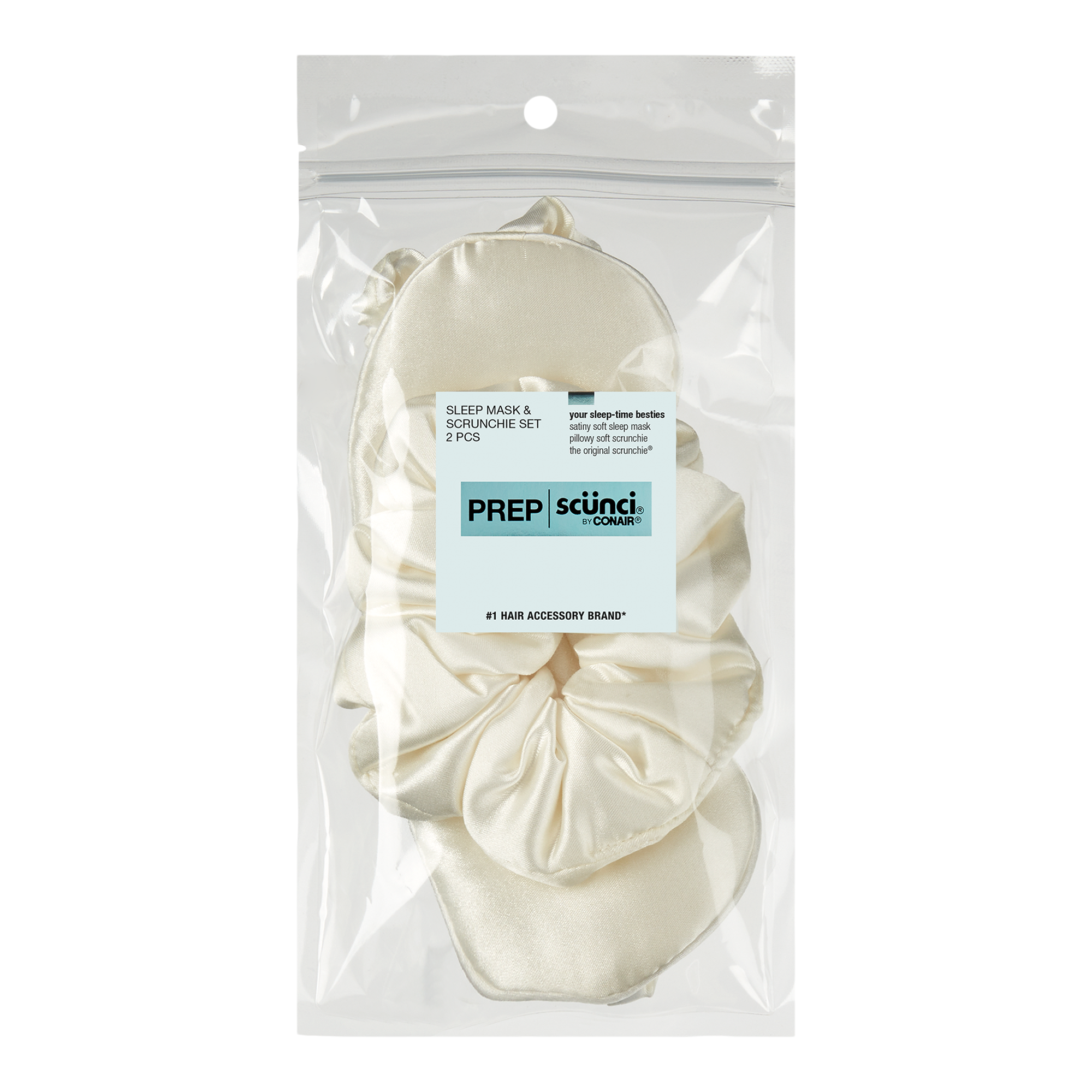 Drift off with the scünci Prep satin sleep mask and scrunchie set. The soothing mask blocks light and soft scrunchie keeps hair free from frizz and damage.