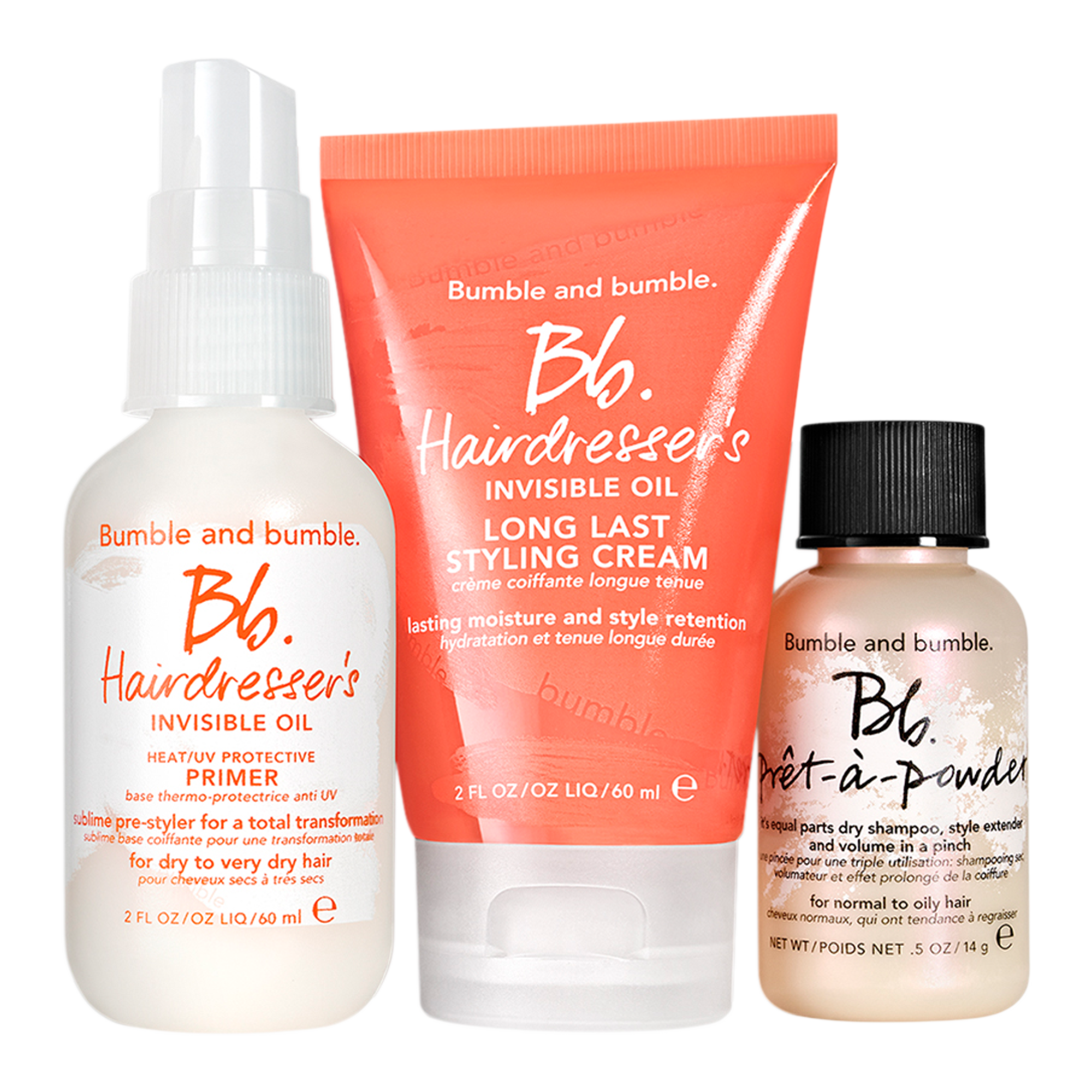 From the pros: Like the name says, Hairdresser's Invisible Oil Heat/UV Protective Primer protects against heat tools up to 450°F/232°C. Spritz on liberally before heat styling. Bonus benefit: it also helps protect color from fading for up to 16 washes. Apply Hairdresser's Invisible Oil Long Last Styling Cream to mid lengths and ends to get the benefits of the products where the hair needs the most retention. Start by applying Hairdresser's Invisible Oil Heat/UV Protective Primer all over to detangle then apply Hairdresser's Invisible Oil Long Last Styling Cream for hydration and style retention. Apply Prêt-à-powder before backcombing for building volume for updos or to add texture to second-day hair.