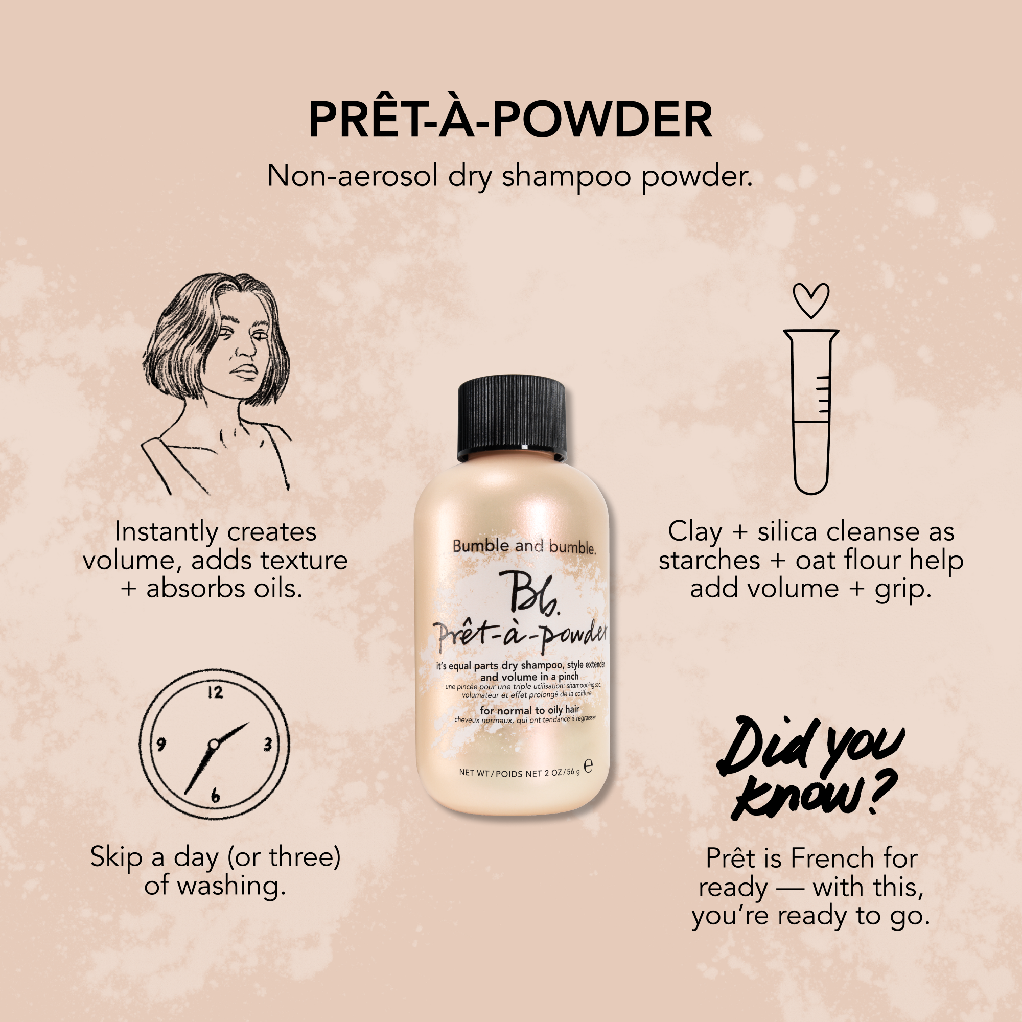 Bumble and bumble Pret-A-Powder is a soft, fine dry shampoo powder, style extender, and volumizer that instantly absorbs oil and refreshes styles while adding texture and volume.