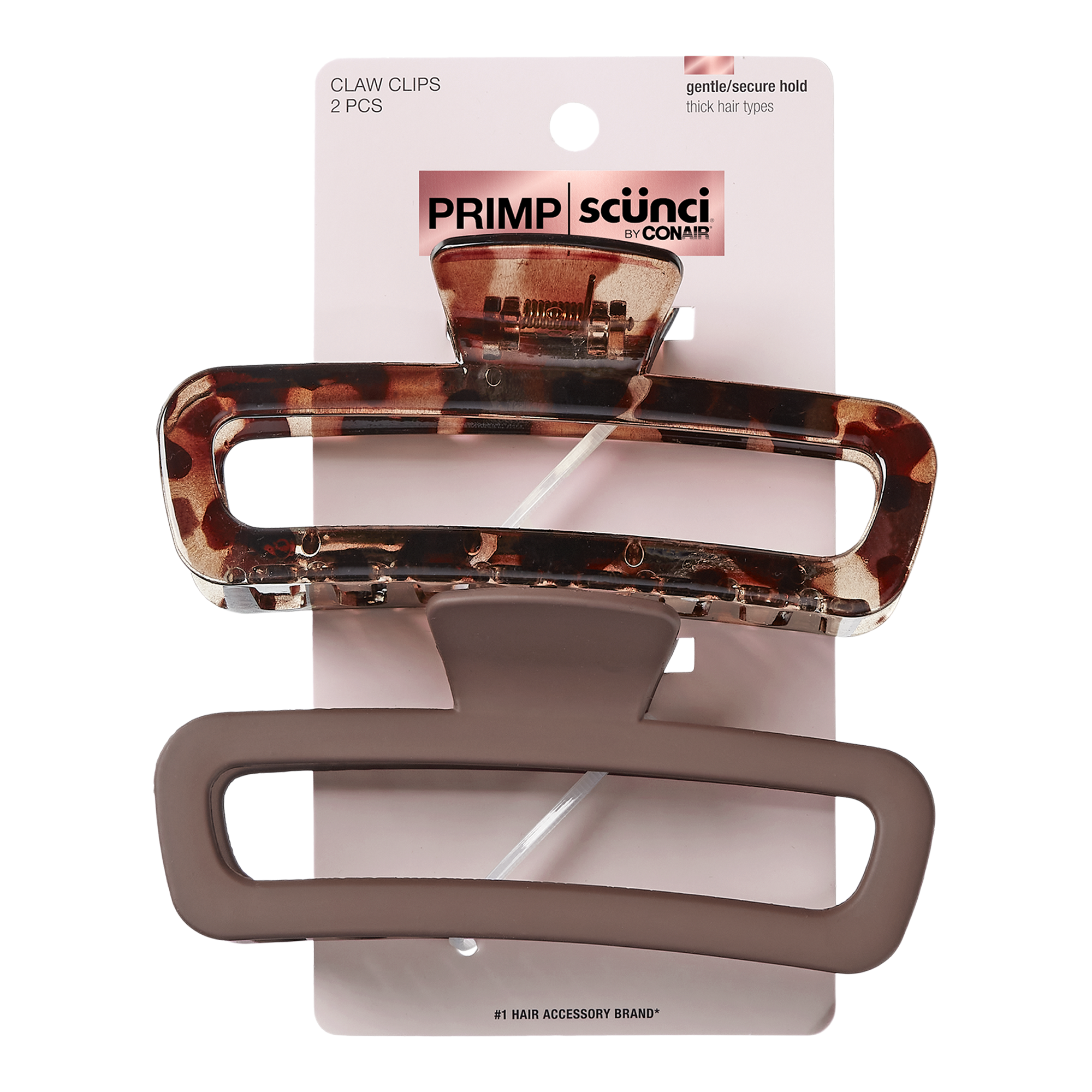 Secure a twist or updo in classic style with these Scünci PRIMP rectangular claw clips. One open-cut claw clip comes in a trendy tortoiseshell print, the other has a shiny black finish—both clips are the perfect complement to all hair colors.