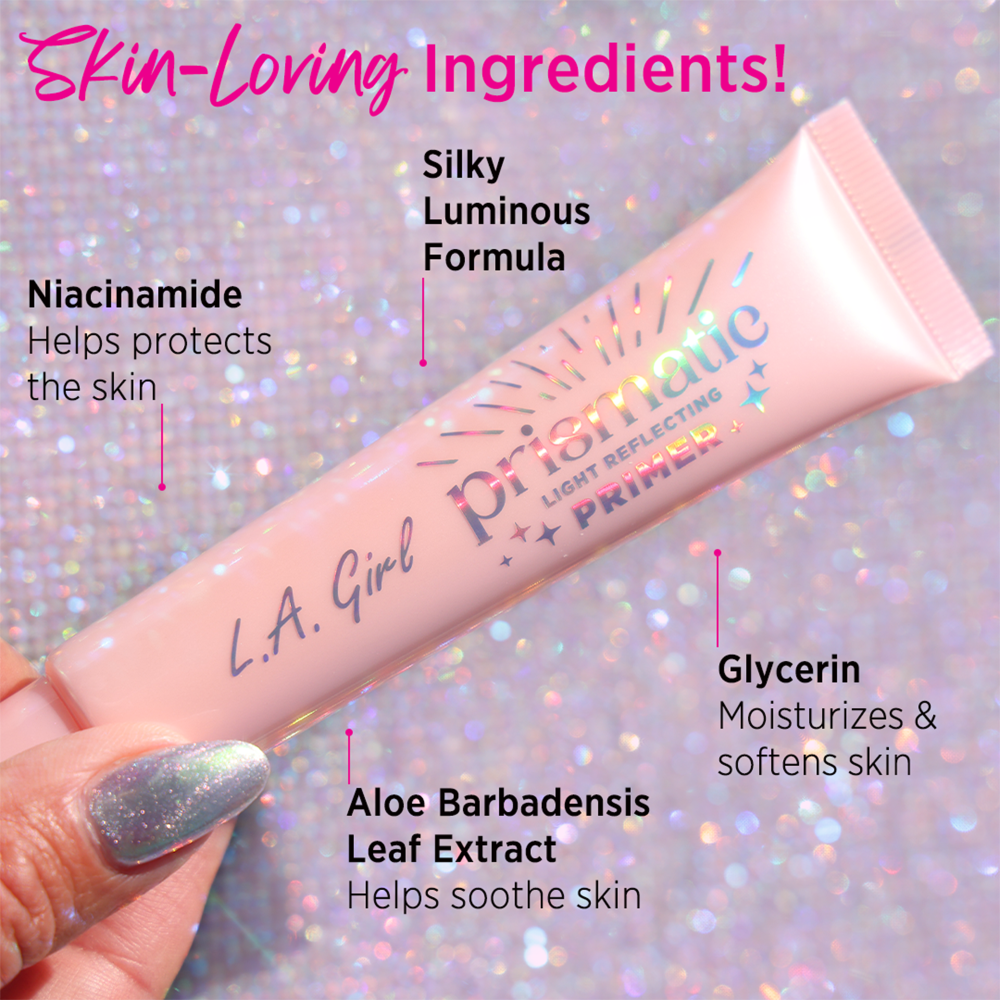 Introducing L.A. Girl's Prismatic Light Reflecting Primer for a radiant complexion. Enriched with niacinamide, aloe leaf extract, and glycerin, it elevates your glow. Smooth and hydrate for flawless, radiant skin. Wear alone for extra glow or under makeup for subtle luminosity.
