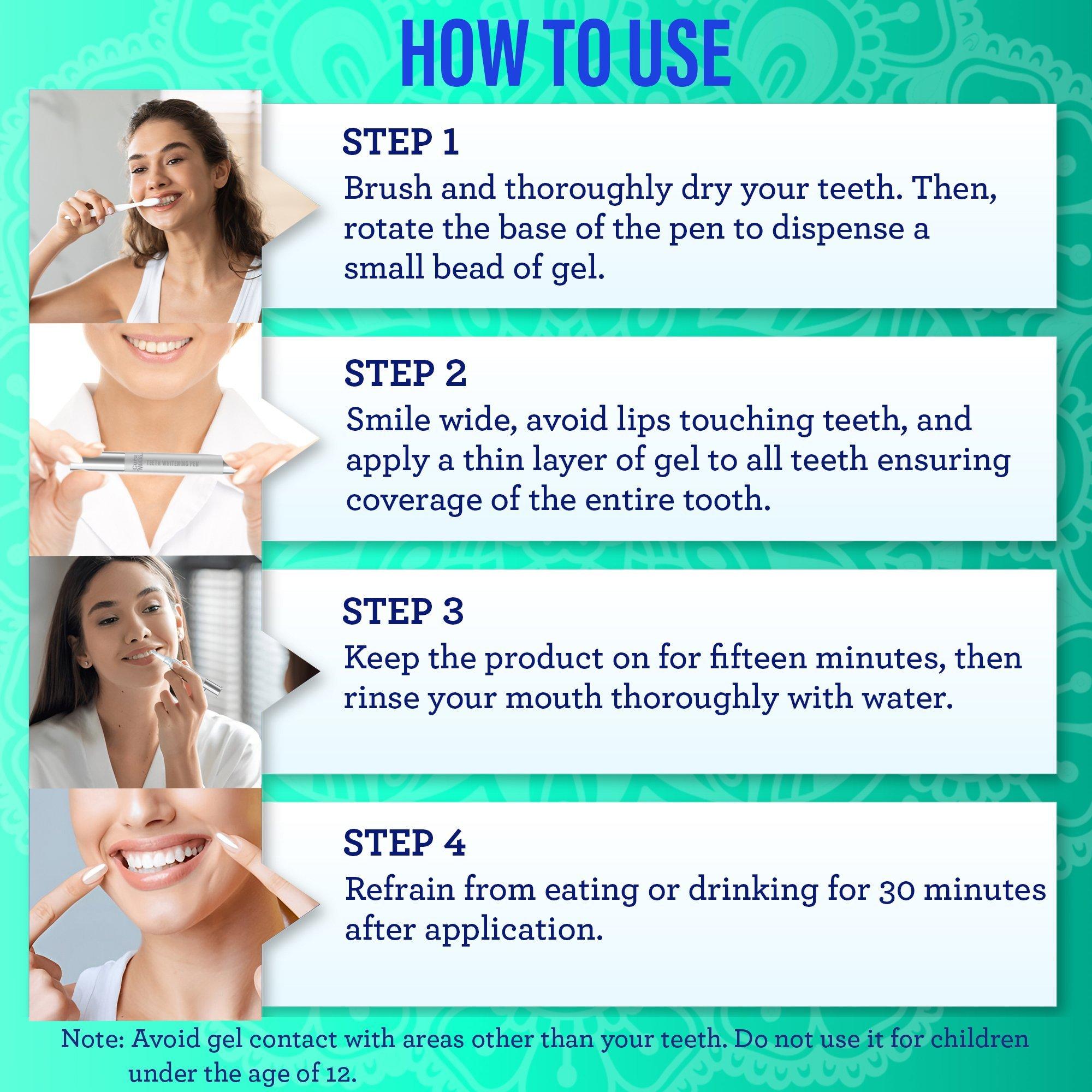 Brush \& dry your teeth, twist the pen to dispense the gel, and apply it evenly. Wait 15 minutes before rinsing, and avoid eating or drinking for 30 minutes. Not recommended for children under 12.