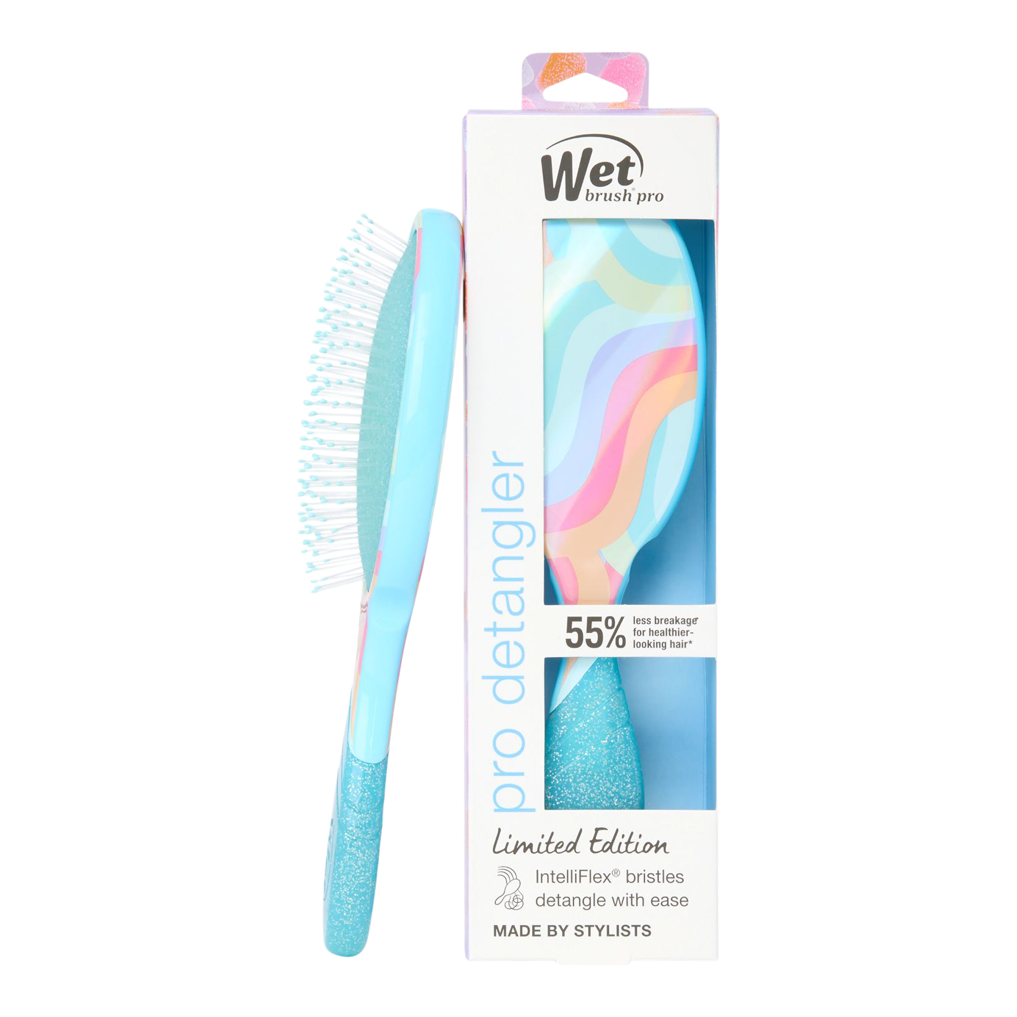 Wet Brush Pro Detangler Rainbow Strips adds a sweet splash of color with bold, wavy stripes in candy-inspired hues. Crafted with IntelliFlex® bristles, it detangles effortlessly while reducing breakage for strong, healthy-looking hair. Perfect for styling with vibrant, playful flair.