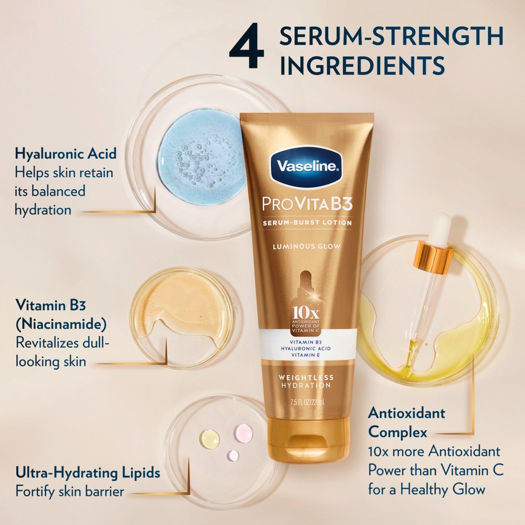 Slip into soft, supple skin with Vaseline Pro VitaB3 Serum Burst Lotion - a unique lotion-to-serum sensory that feels light and breathable, leaving behind a soft-velvet feel on skin.