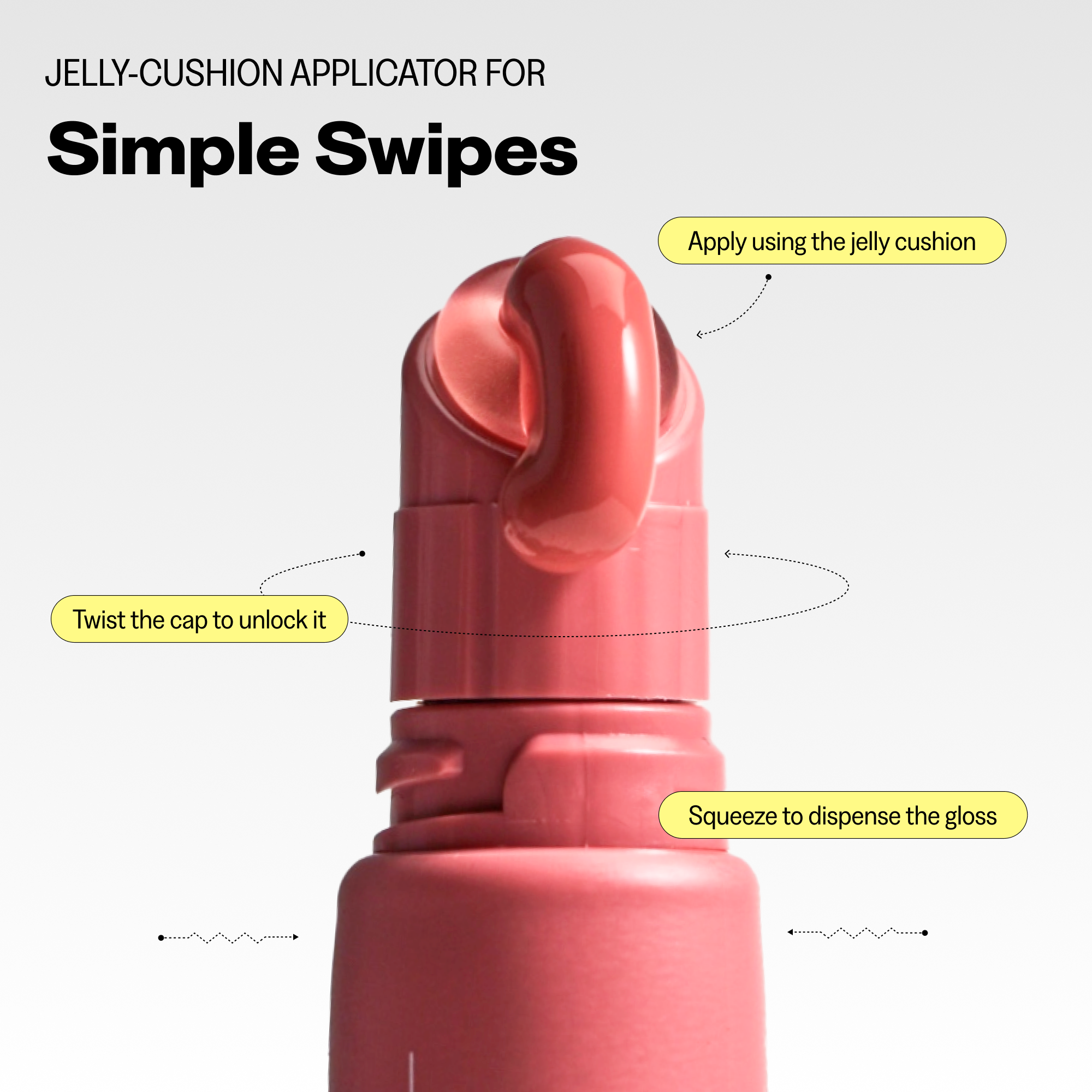 Twist the cap counterclockwise to unlock it. Gently squeeze the tube to dispense the desired amount of gloss. Apply using the jelly cushion and keep swiping for more color.