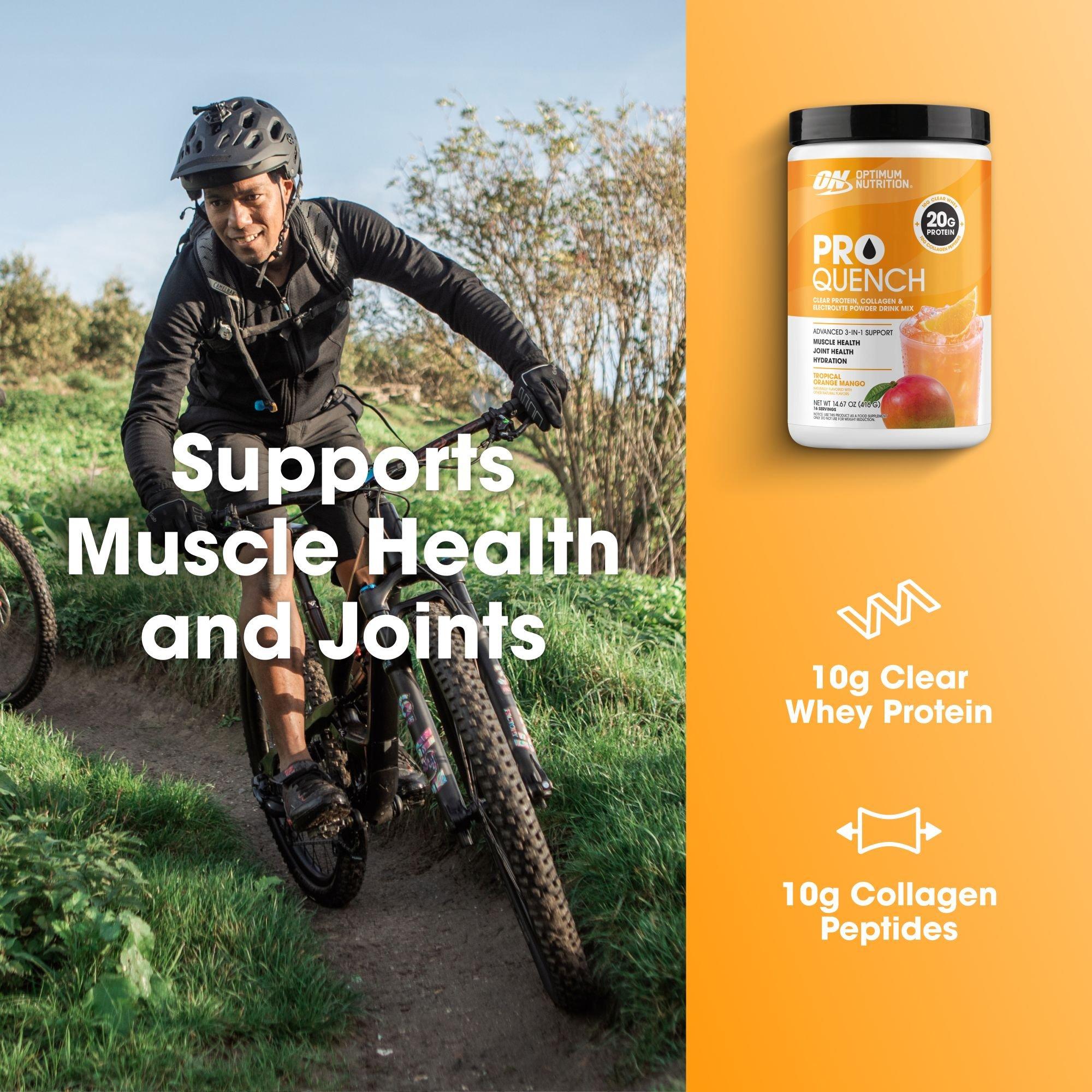 PRO Quench – an enhanced 3-in-1 sports drink mix that delivers refreshingly smooth fruit flavor, a total of 20g of protein, and electrolytes in every serving. With 10g of premium clear whey protein isolate and 10g of collagen peptides, you get a one-two punch that supports muscle and joint health.