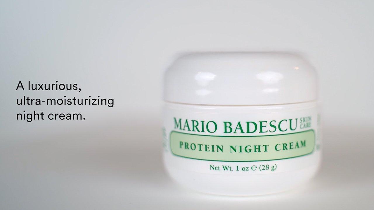 Mario Badescu's Protein Night Cream is a protein-enriched face cream that is an ultra-emollient, anti-aging, collagen and peptide-based moisturizer packed with Vitamin A, Beeswax, and more to soften and smooth skin.