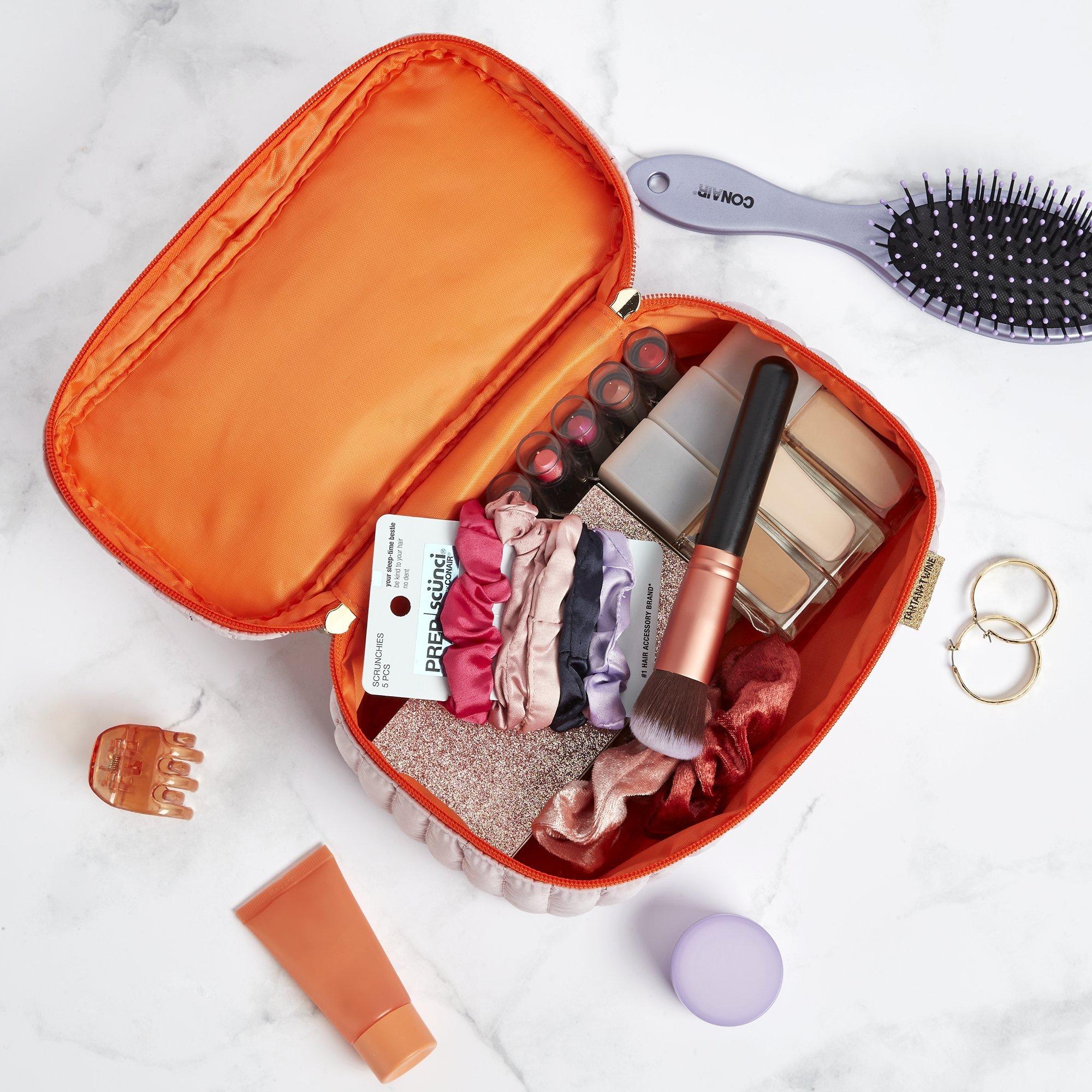 From brushes to gloss, the Tartan + Twine Puffer Train Case packs your beauty routine into a lilac case with bold orange trim and gold-tone hardware.