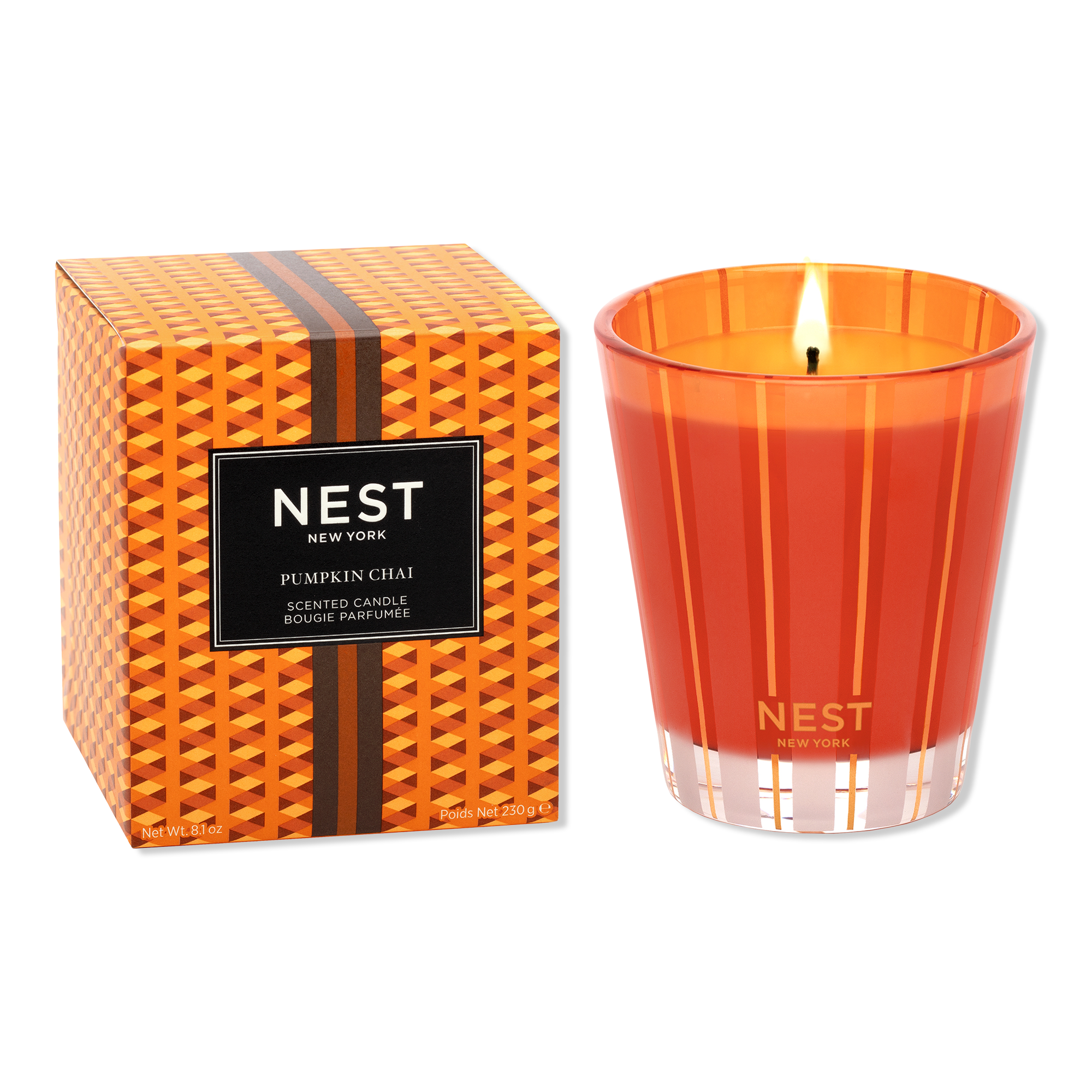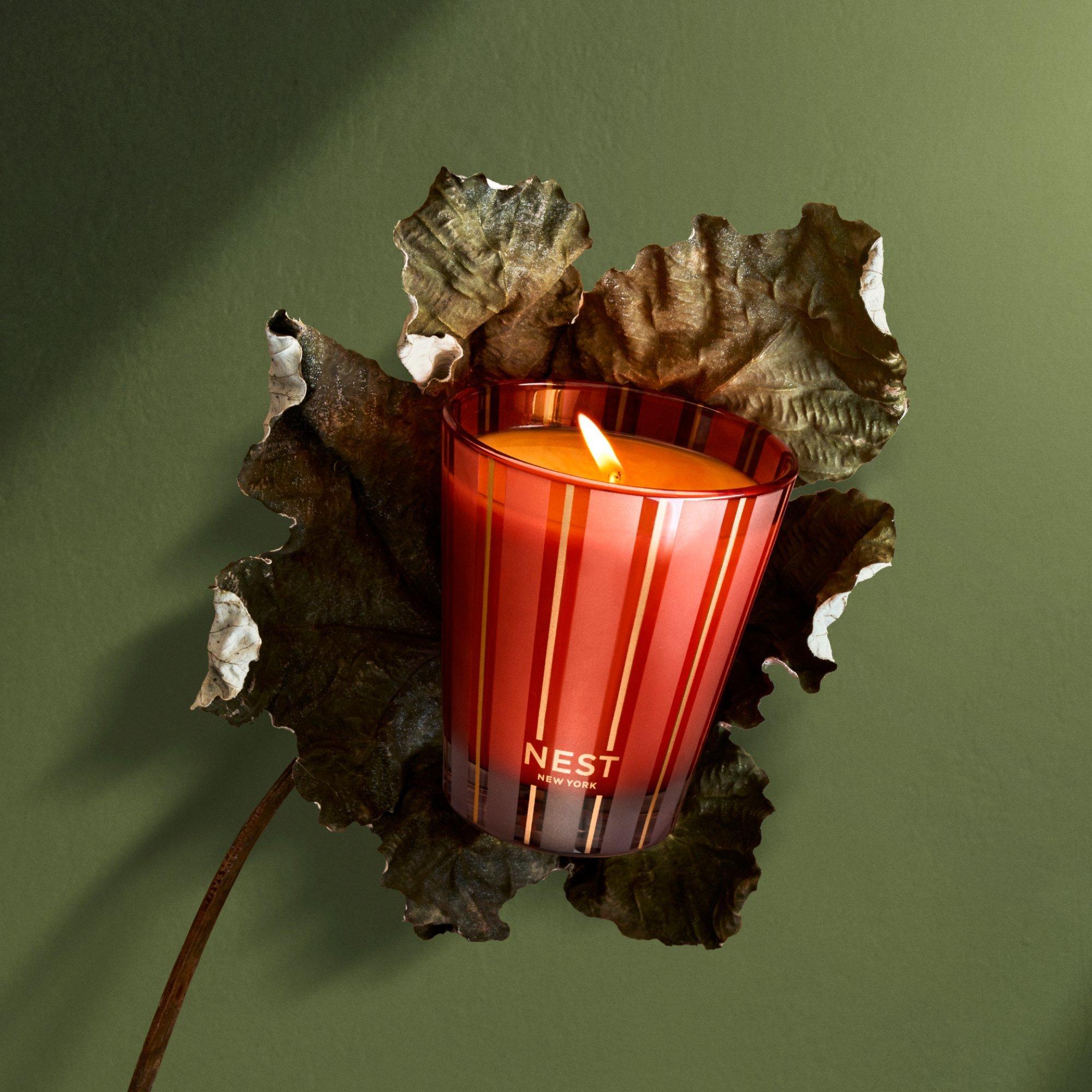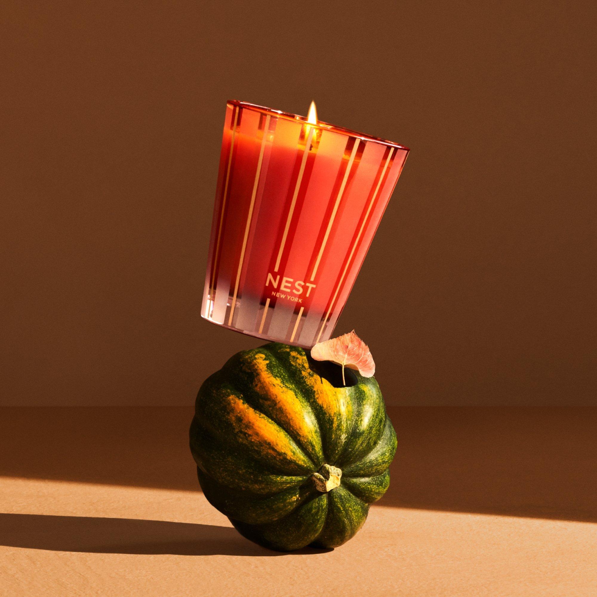 Create a cozy autumn ambiance with this exquisitely fragranced Classic Candle from NEST New York featuring a blend of wild pumpkin, spicy masala chai, cardamom, ginger, and cinnamon.