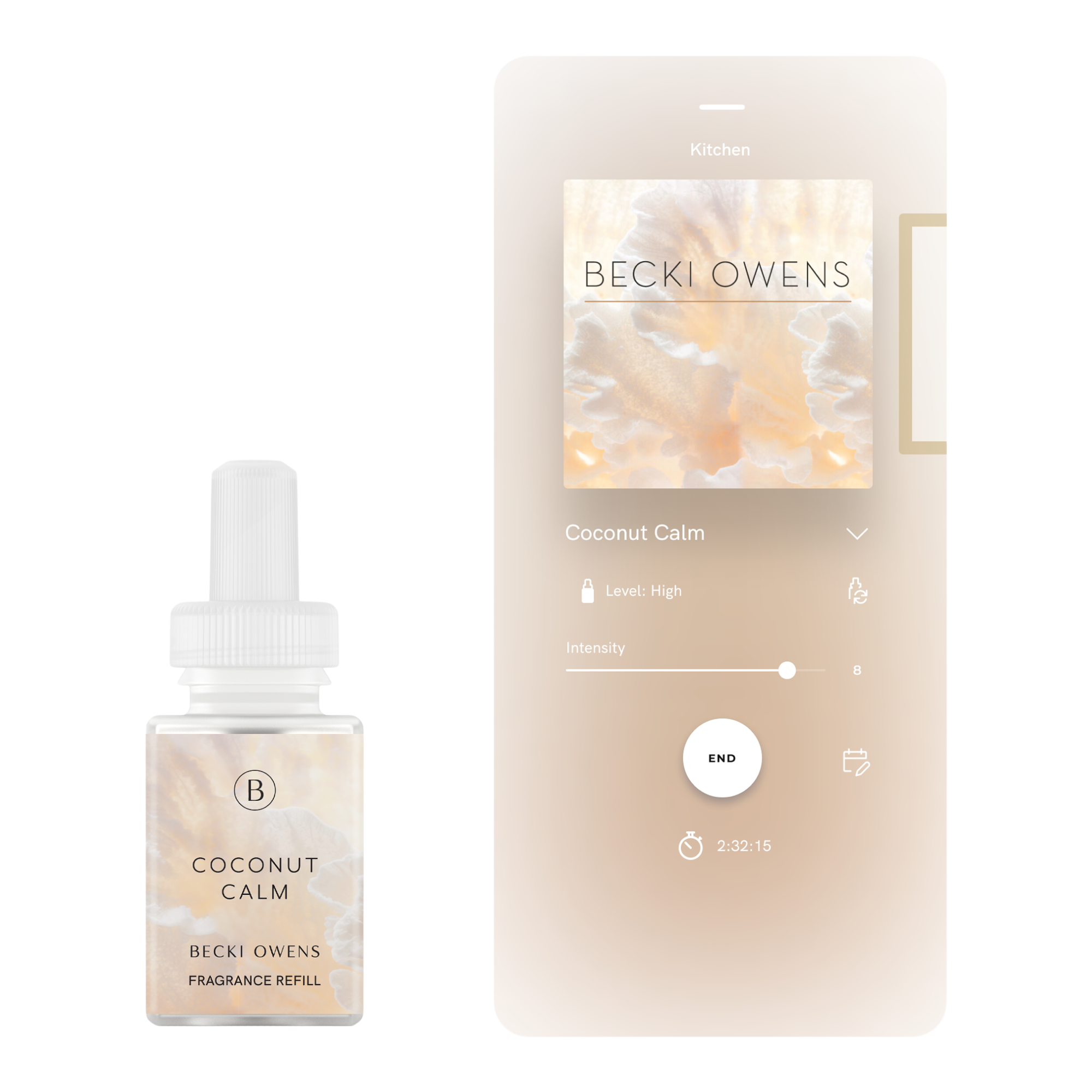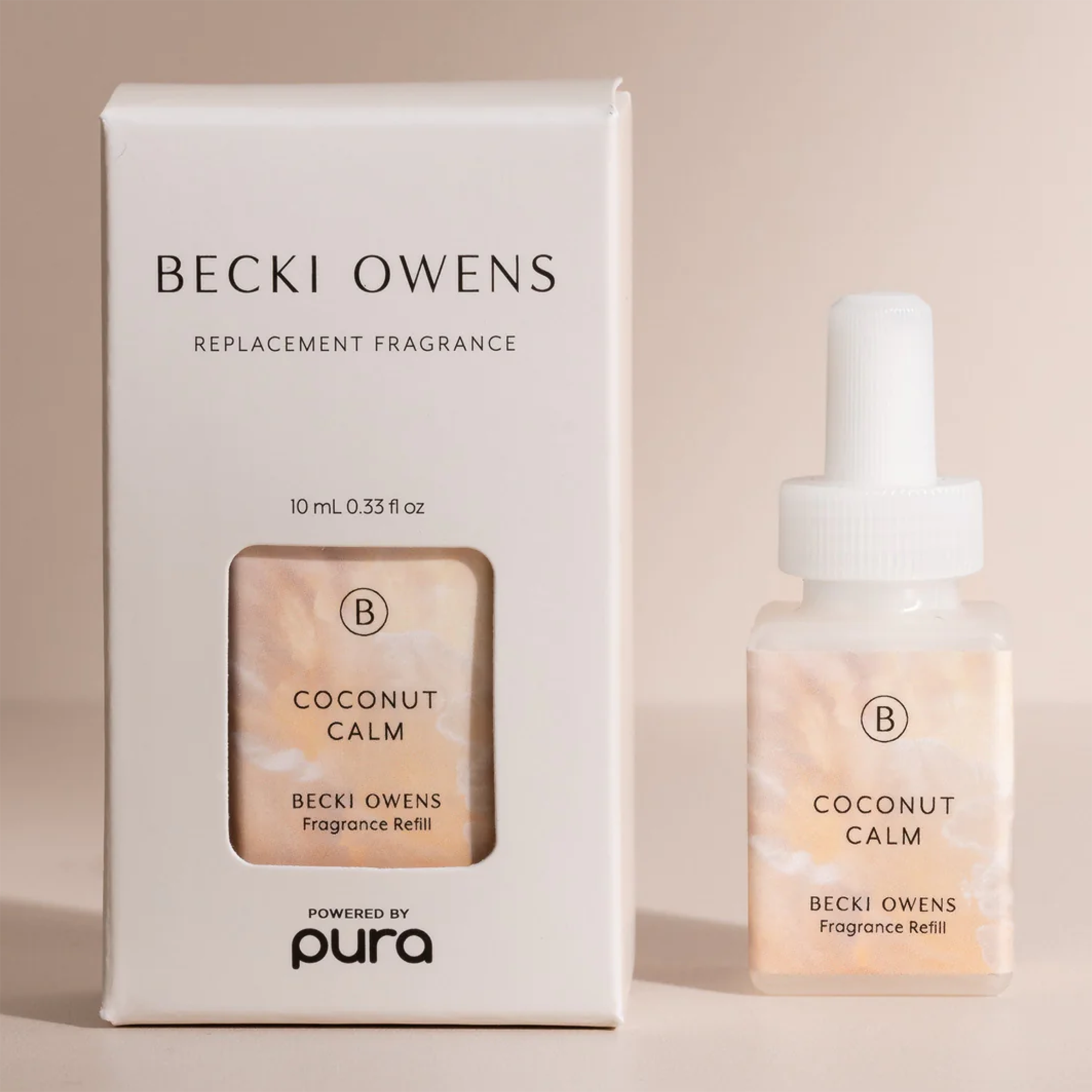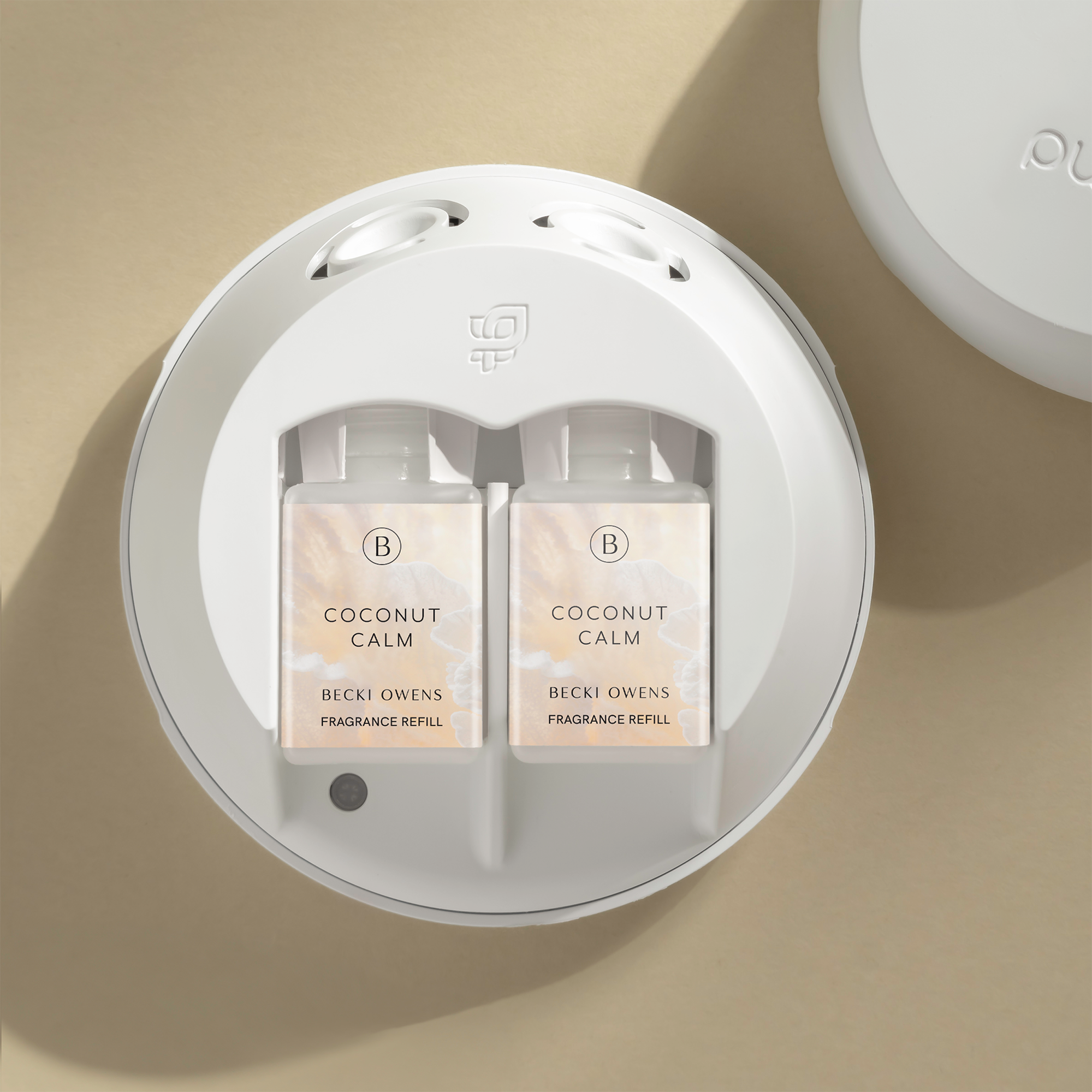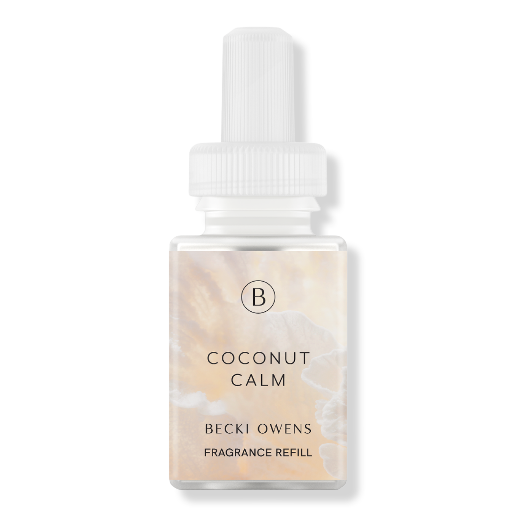 Pura X Becki Owens Coconut Calm Smart Vial Diffuser Refill. Coconut Calm welcomes the perfect summer day. Feel endless summer sensations with cool ocean breezes, dreamy island coconut, and sensuous vanilla bean. Use this with your Pura Smart Fragrance Diffuser for an incredible scent experience.