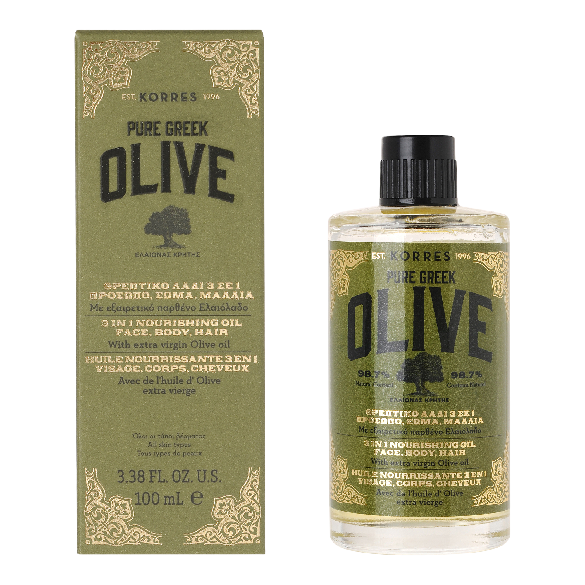 KORRES Pure Greek Olive 3-in-1 Nourishing Oil is the ultimate skincare multi-tasker made with Pure Greek Olive oil, formulated to restore vital antioxidants, vitamins and omega fatty acids that nourish and hydrate skin from head to toe.