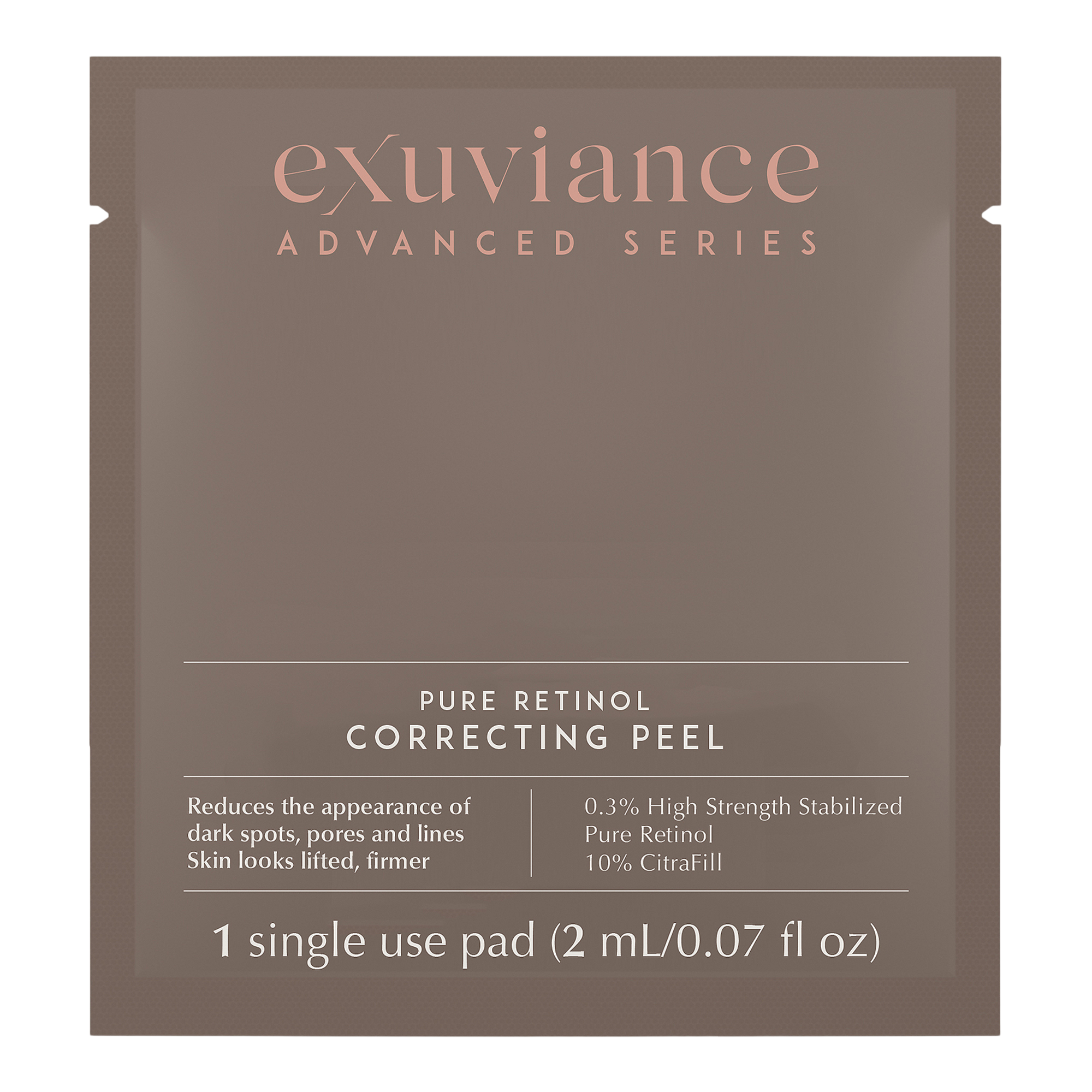 Exuviance Pure Retinol Correcting Facial Peel is an intensive correcting peel with 0.3% high strength Pure Retinol and 10% CitraFill, rejuvenates visible signs of aging - dark spots, uneven skin tone, pores and lines - for instant skin resurfacing, renewal and visible firming.