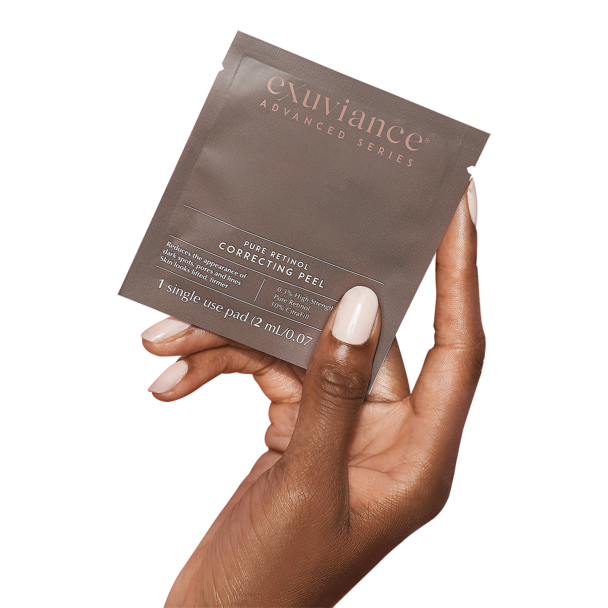 Exuviance Pure Retinol Correcting Facial Peel is an intensive correcting peel with 0.3% high strength Pure Retinol and 10% CitraFill, rejuvenates visible signs of aging - dark spots, uneven skin tone, pores and lines - for instant skin resurfacing, renewal and visible firming.