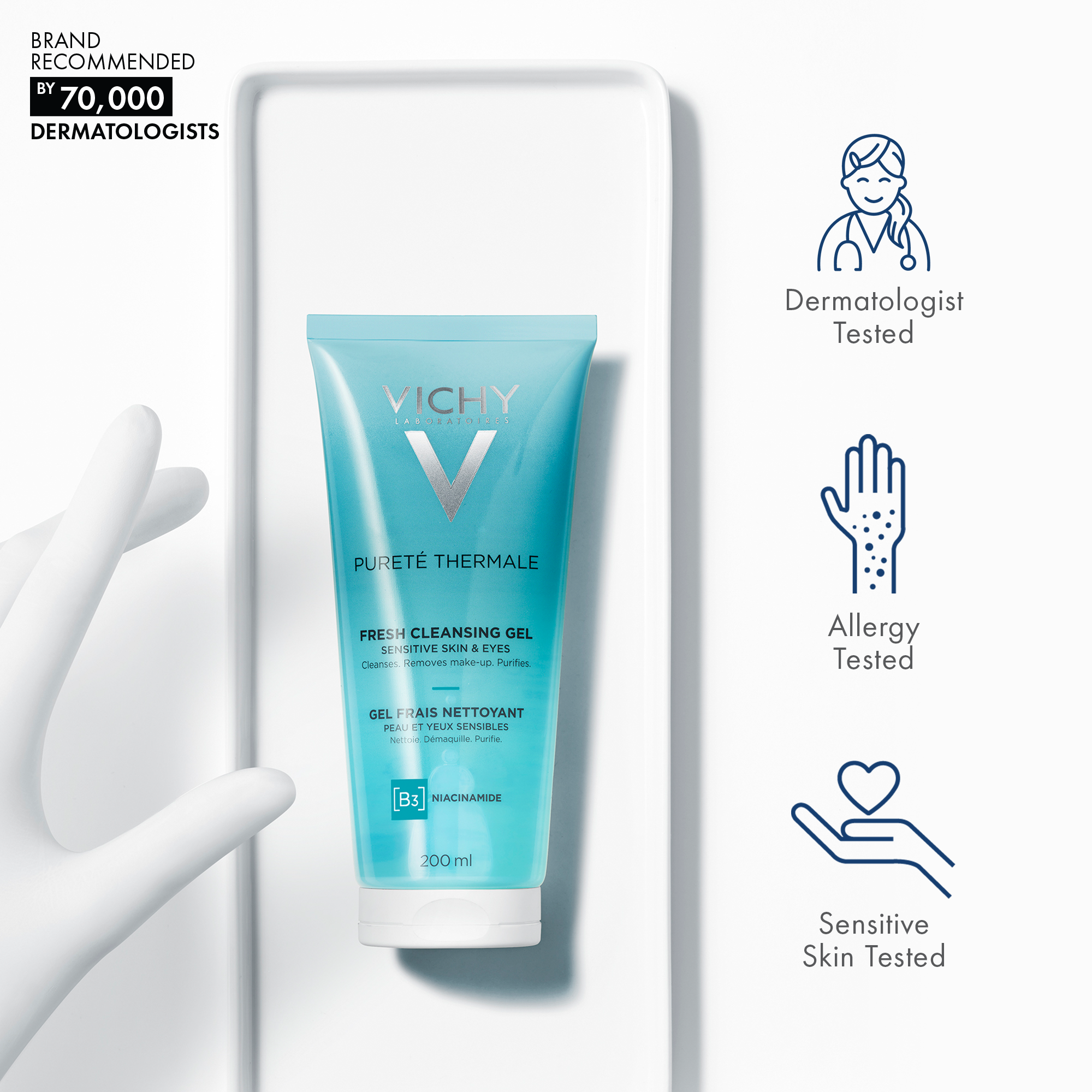 Vichy Pureté Thermale Fresh Cleansing Gel is a gel cleanser formulated with Niacinamide to cleanse impurities and makeup from skin without overdrying or tightness. Dermatologist and ophthalmologist tested, suitable for all skin types.