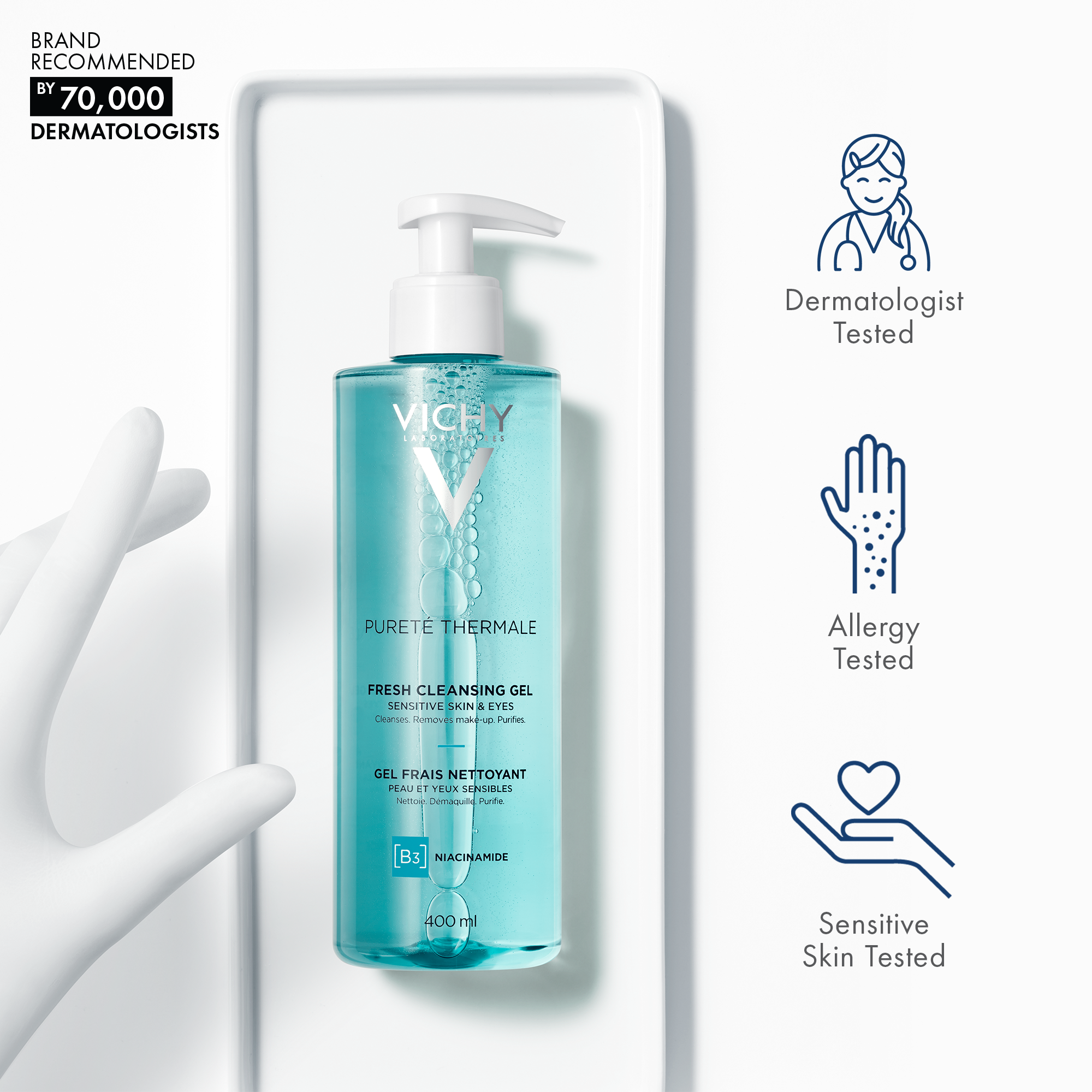 Vichy Pureté Thermale Fresh Cleansing Gel is a gel cleanser formulated with Niacinamide to cleanse impurities and makeup from skin without overdrying or tightness. Dermatologist and ophthalmologist tested, suitable for all skin types.