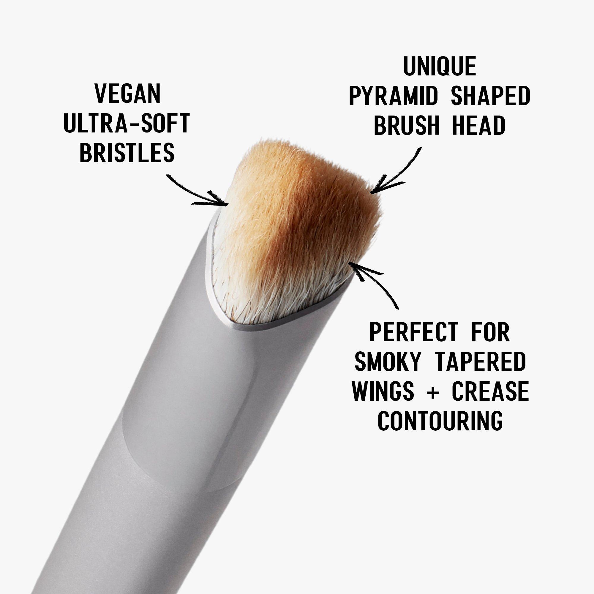 Use the tapered tip of the brush to softly blend out color in the crease of the eye or create a smokey shadow wing. Use flat edge of pyramidal brush head to "stamp" a shadow wing on the outer corner of the eye.