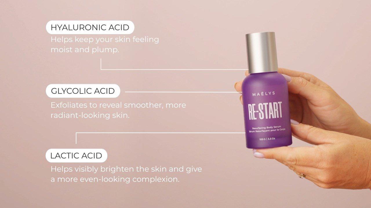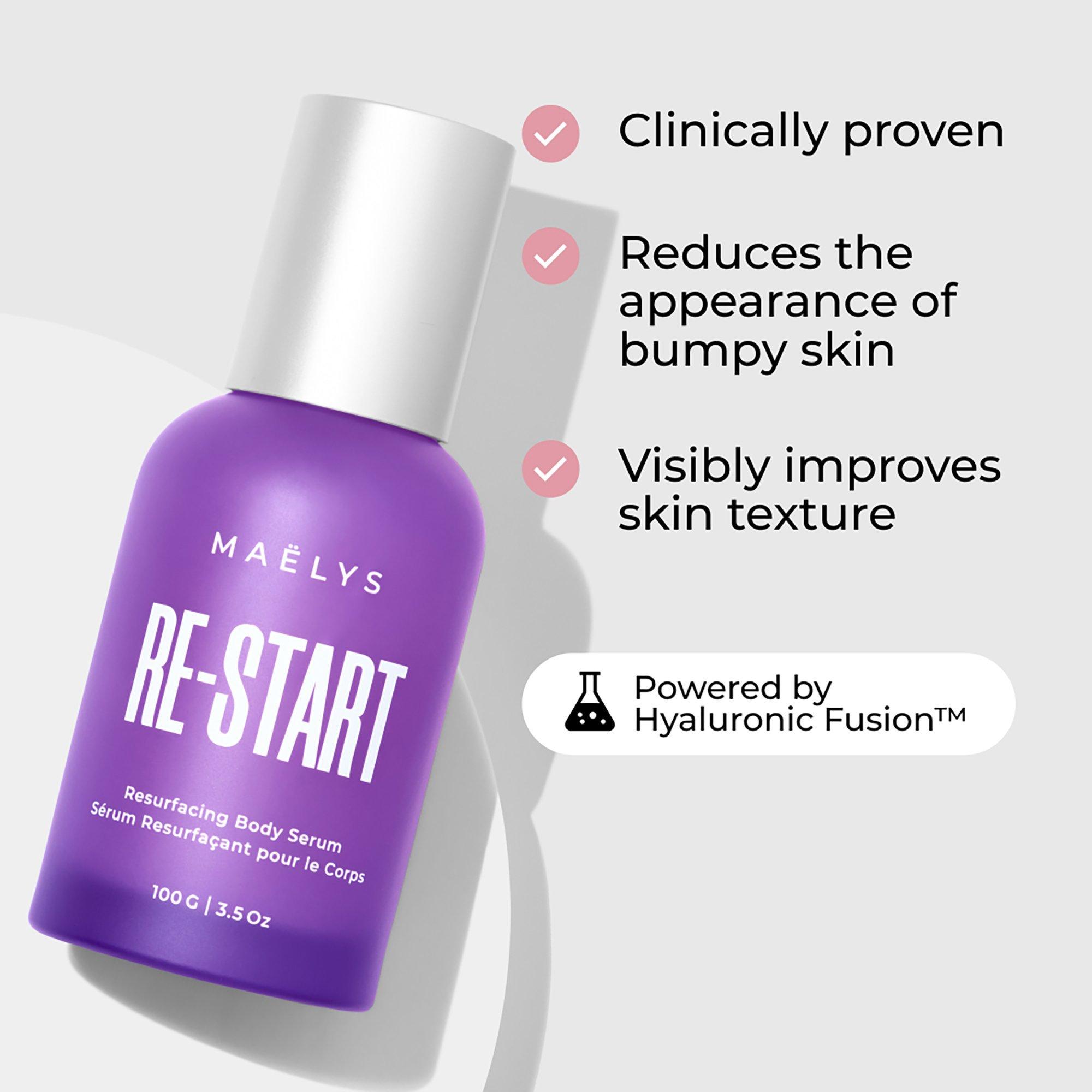 MAËLYS RE-START Resurfacing Body Serum is a clinically proven AHA body serum designed to help visibly refine texture for a smoother look. Powered by Hyaluronic FusionTM technology, Lactic & Glycolic Acid, & Niacinamide, it delivers multi-level exfoliation, leaving your skin feeling hydrated & smooth.