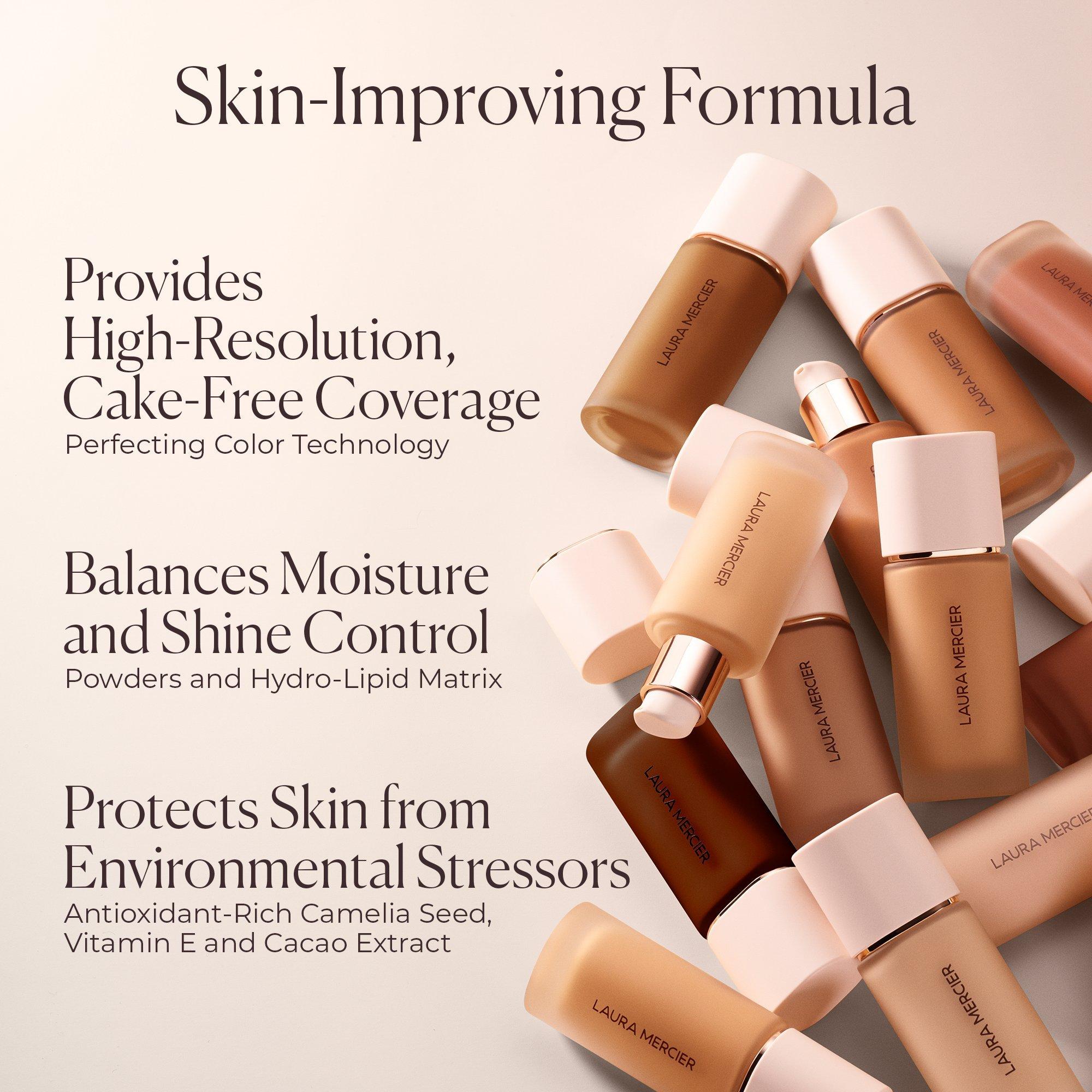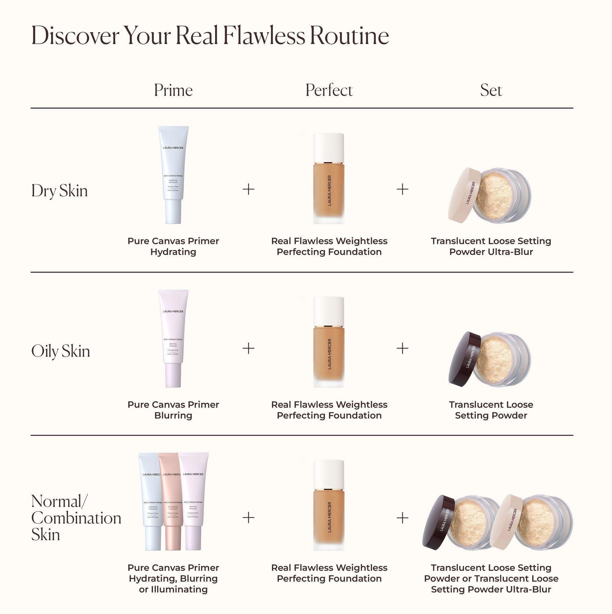 For optimal wear, this foundation works best with silicone-free primers, like any of the Laura Mercier Pure Canvas Primers. After your finished look, set with your preferred Laura Mercier setting powder for all day wear (both sold separately).