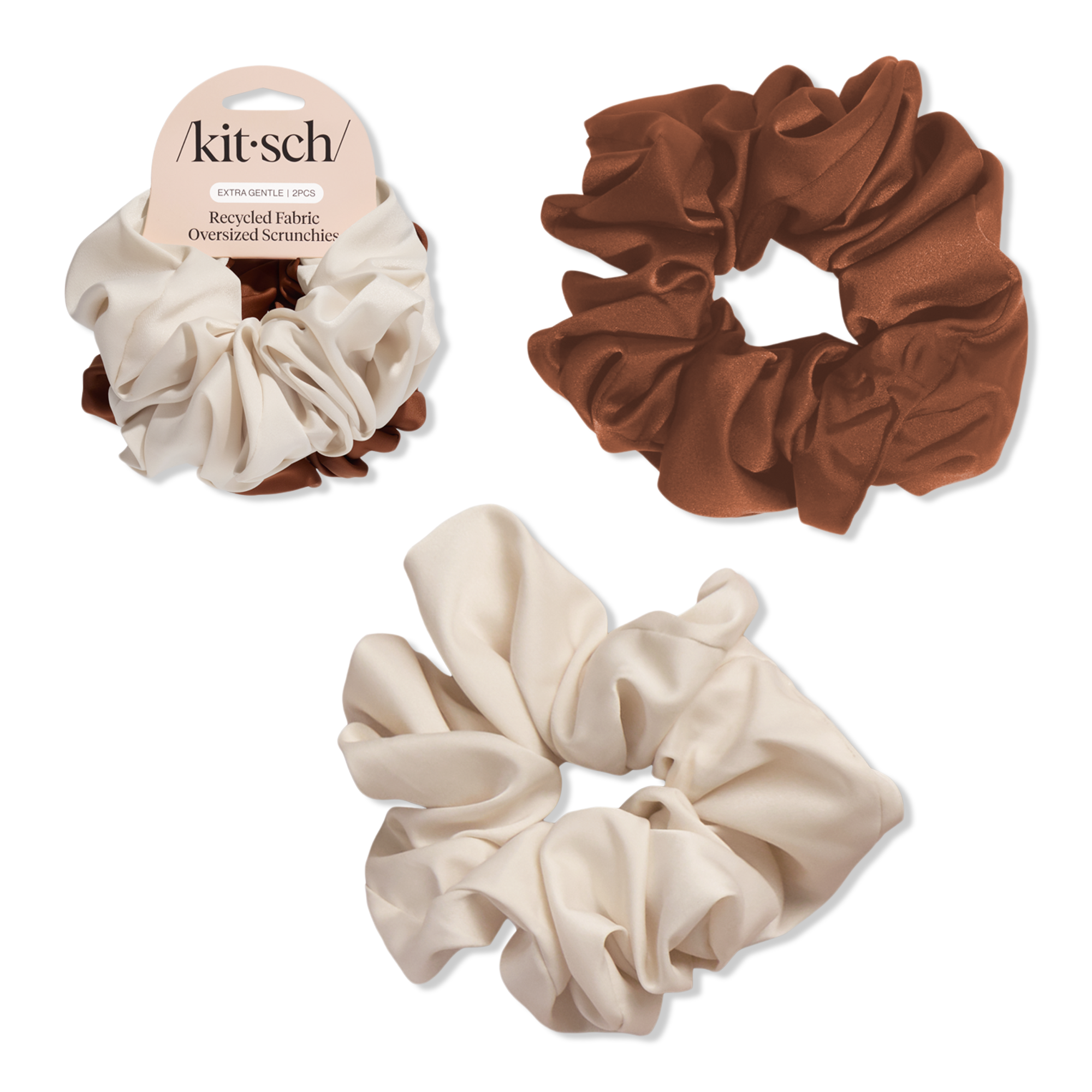 Give your ponytail or bun a stylish upgrade with the Kitsch Brunch Scrunchies in. Crafted from luxurious recycled satin, these oversized scrunchies not only help keep frizz and tangles at bay but also add a lovely, feminine flair—making them a fantastic choice for any hair type.
