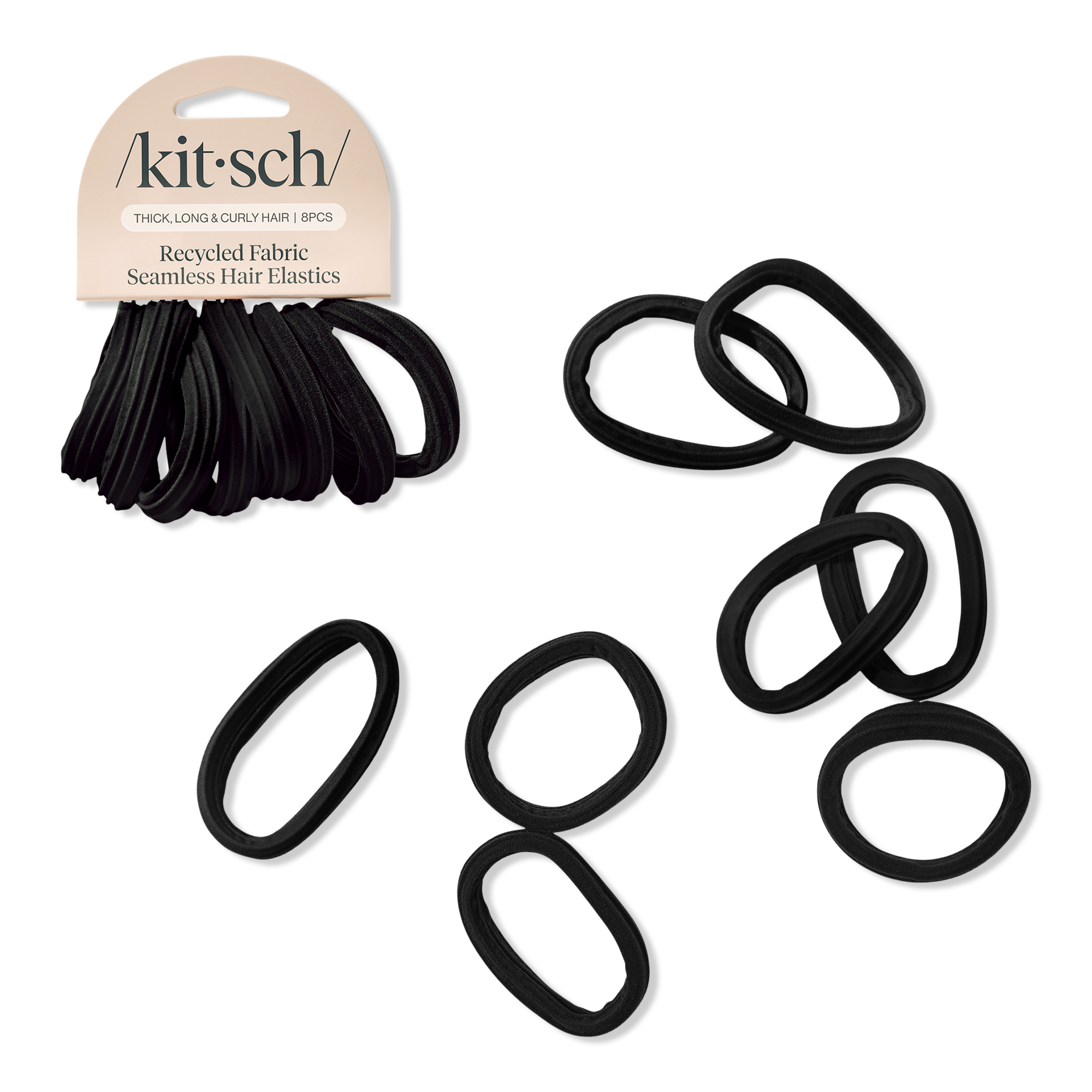 Kitsch Recycled Fabric Seamless Hair Elastics are your everyday styling essential. These elastics tie up your ponytail, bun, or half-up while being gentle on your hair. Experience the slip-free, soft comfort of these versatile black elastics, great for fine, thick, straight, and curly hair!