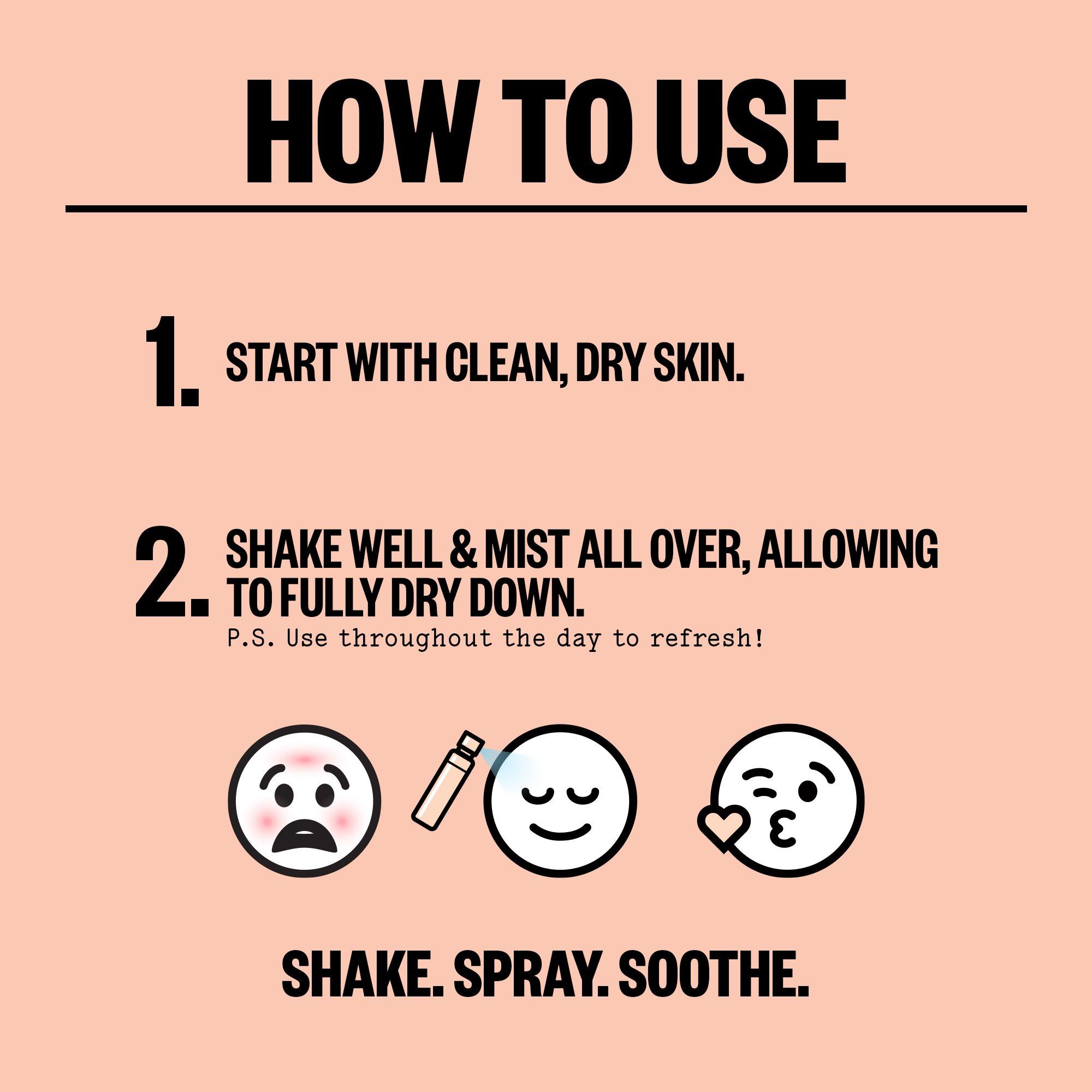 For best results, shake well and mist over clean skin morning and night. Allow to fully dry down before applying serum or moisturizer. Can be used throughout the day to refresh. Use mist for angry, splotchy, and blemish-prone skin after workouts or spending time outdoors.