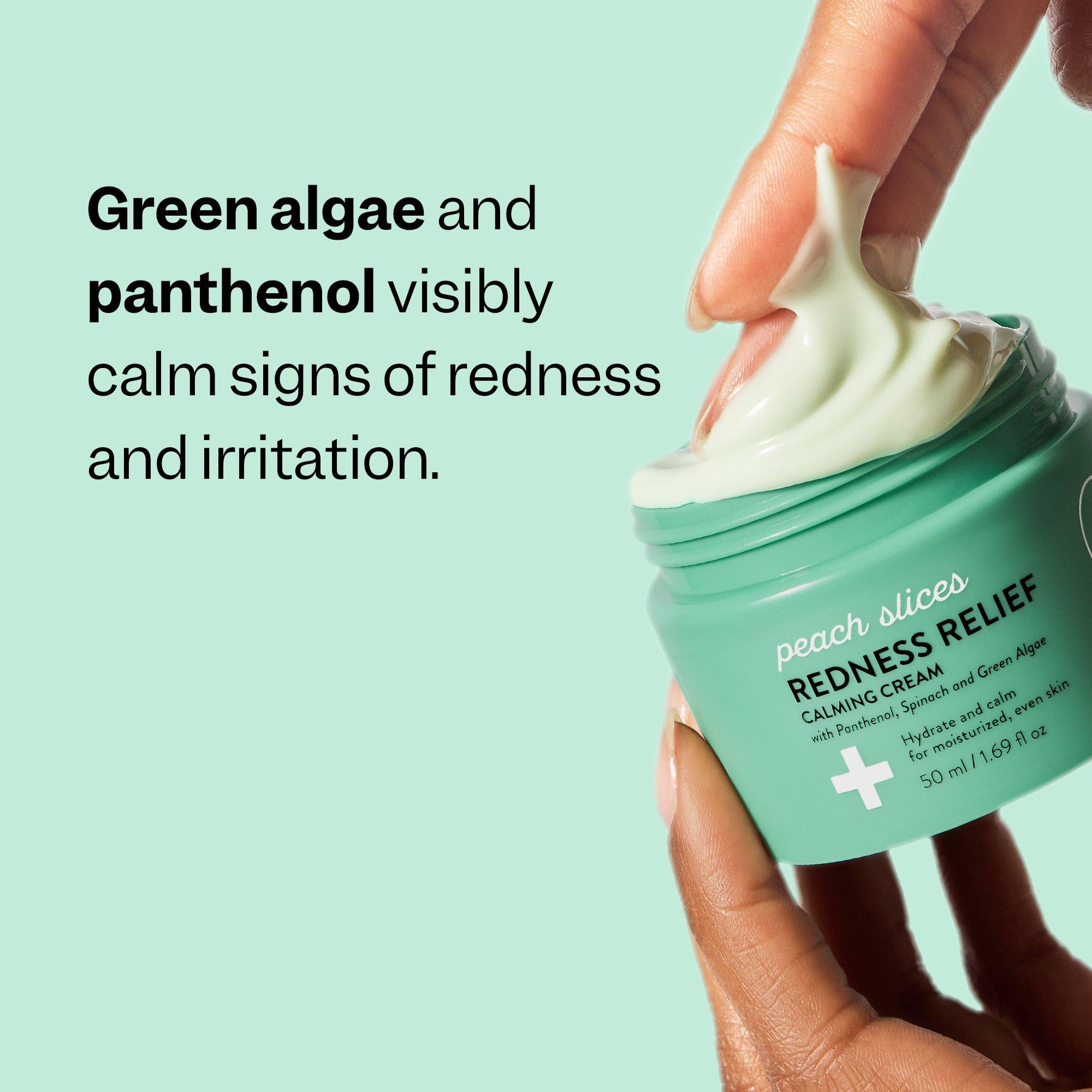 Peach Slices Redness Relief Calming Cream is a deeply hydrating moisturizer that visibly reduces the look of redness and irritation with Green Algae, Panthenol and Spinach.