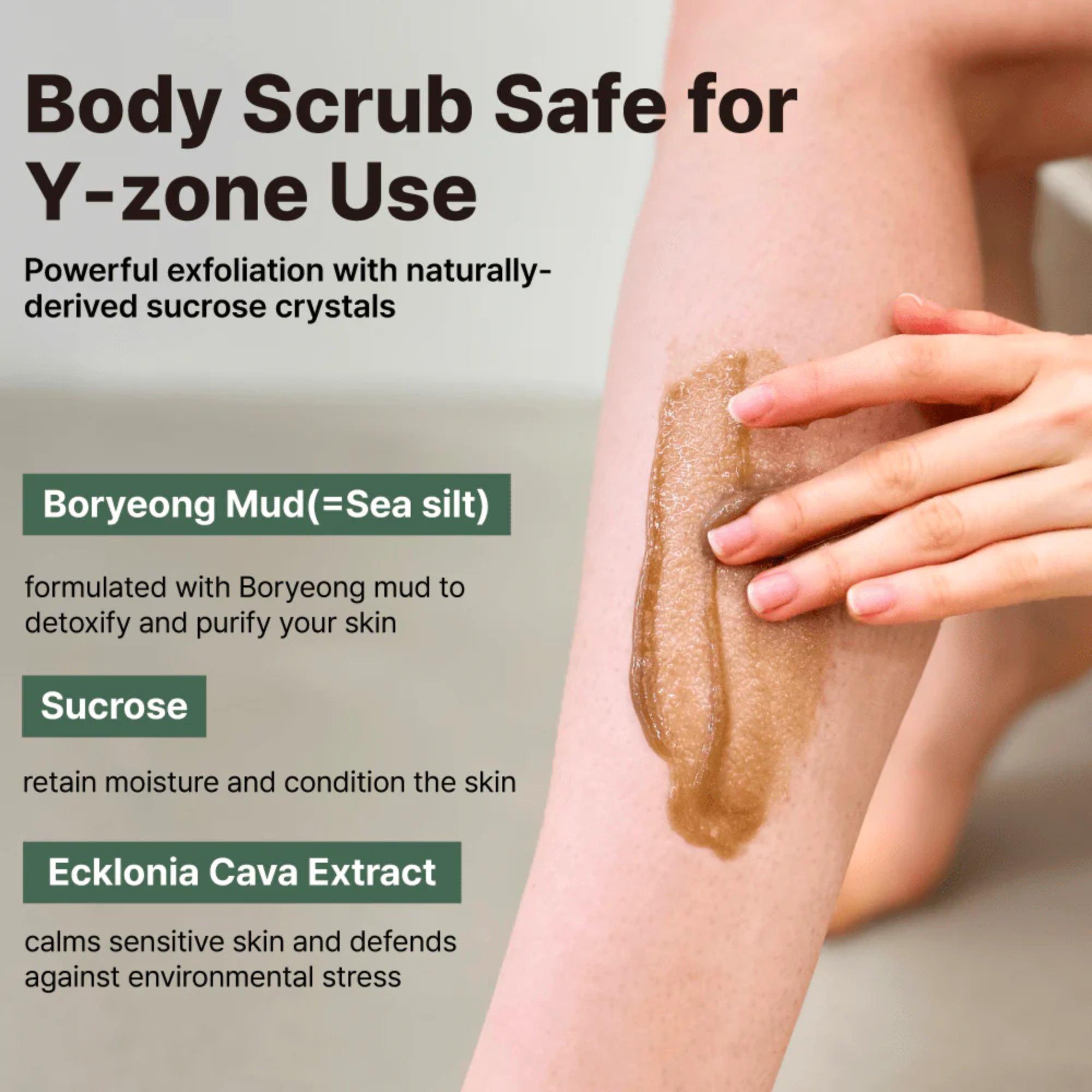 • Gently exfoliate and smooth your skin with this mud-based body scrub formulated for sensitive and post-waxing care. Enriched with Boryeong mud and brown sugar crystals, it helps remove dead skin cells, reduce ingrown hairs and razor bumps, and calm irritation. Hypoallergenic and suitable for delicate areas.